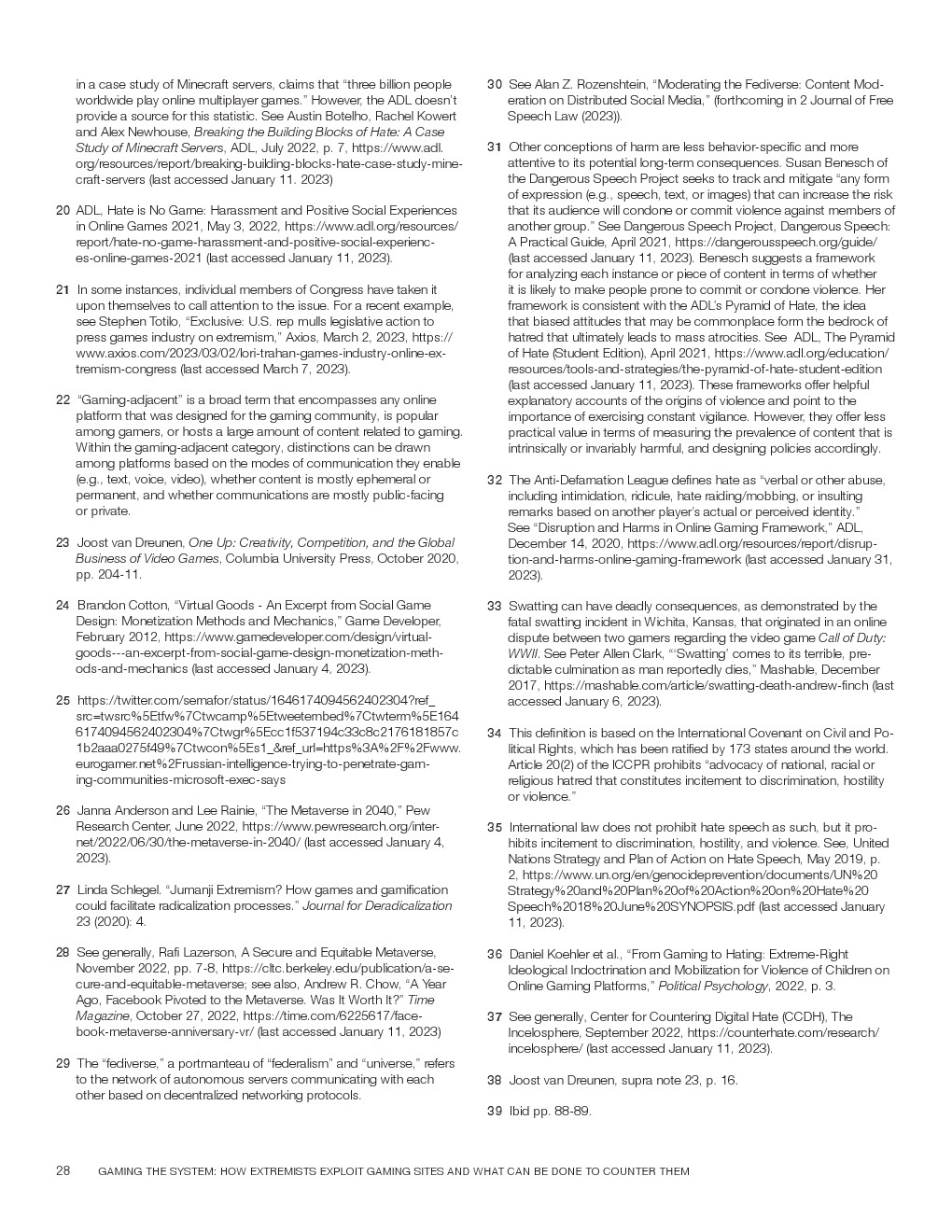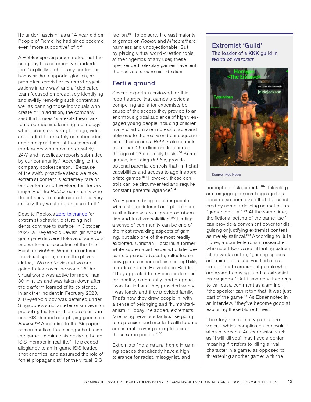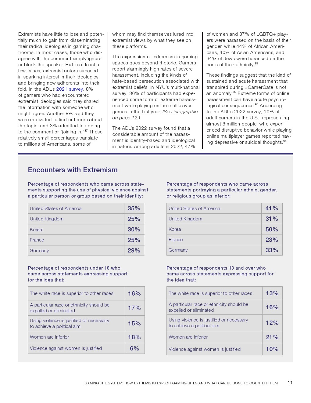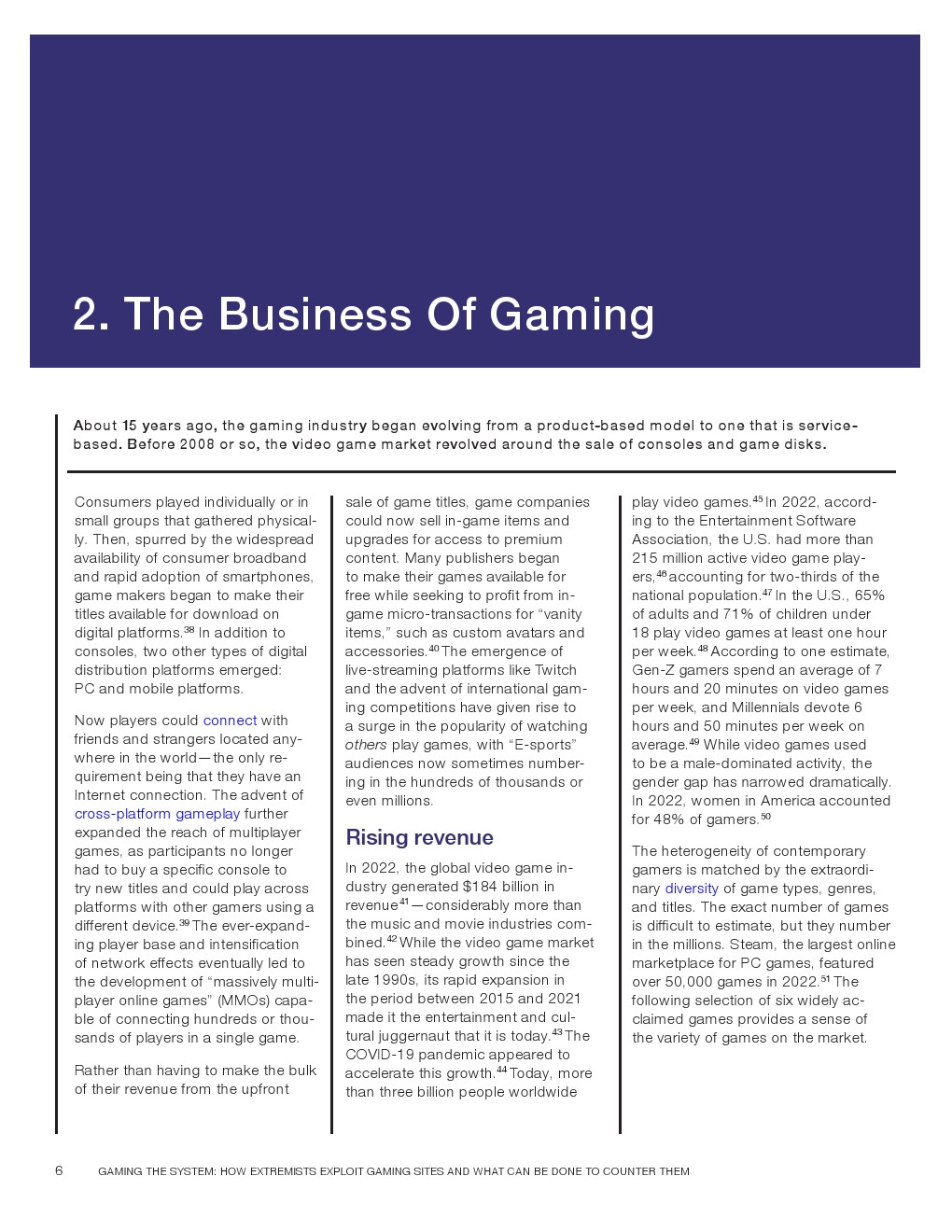 越来越多的证据表明,不良行为者利用电子游戏和相关平台的基本特征,传播基于仇恨的言论,与潜在的同情者建立联系,并动员采取行动,有时会带来致命的后果。极端分子能够相对轻松地操纵游戏空间,这表明行业参与者需要采取紧急行动,以避免进一步的伤害。尽管一些游戏公司最近已经投资了内容审核技术和系统,但大多数公司在适当管理和减少平台滥用方面仍然远远落后。