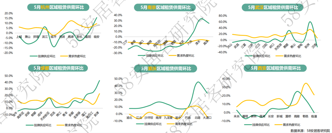 供需热点:5月,一线城市中,北京和上海基本各区域新增供应环比均呈下跌,需求环比表现相对较好。二线城市中除南京外,多数城市区域供需基本均呈小幅环比回升。