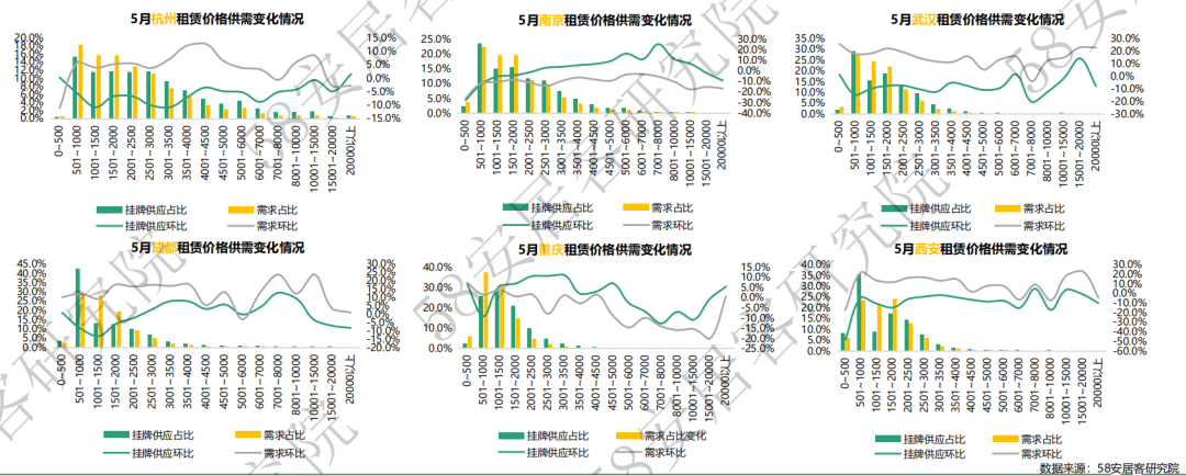 价格供需:北京、上海中低价格供应环比降幅相对更大,广州中高价格房源供应环比降幅更大,深圳1000元/月/套以下低价房源环比上涨超过20%。杭州、武汉中等价位供应下降更显著,西安低价格供应环比降幅较大。