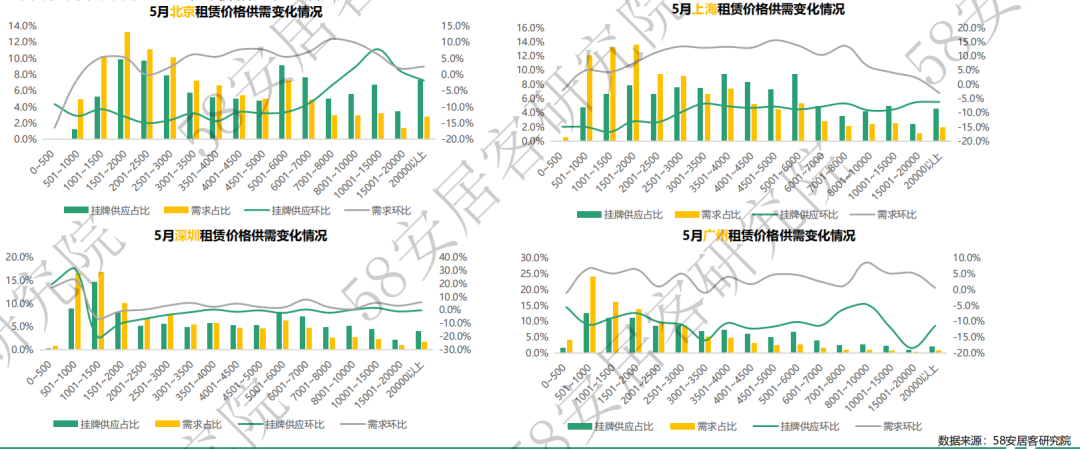 从价格供需环比变化来看,北京、上海中低价格供应环比降幅相对更大;广州则中高价格房源供应环比降幅更大,深圳1000元/月/套以下低价房源环比上涨超过20%,而1000元/月/套以上房源环比供应下降。需求方面,北京、上海1000元/月/套以下低价房源需求环比下降,而以白领为主的中等价格需求小幅回升。