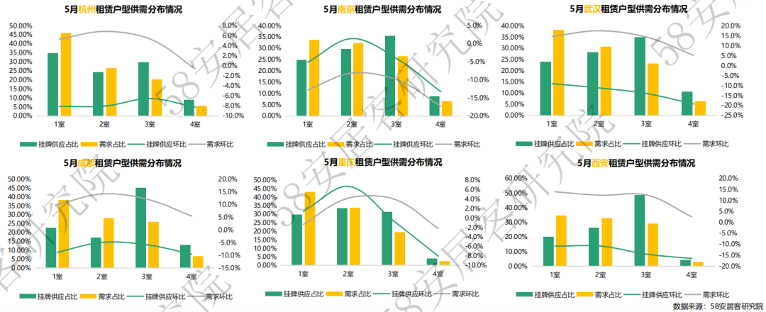 5月,一线城市各类户型供应均呈环比下降,需求较上月环比回升。其中,北京两室户型需求环比回升5.6%。上海一室和两室需求环比上涨8.4%、10.8%。广州、深圳各类户型需求环比均小幅回暖。