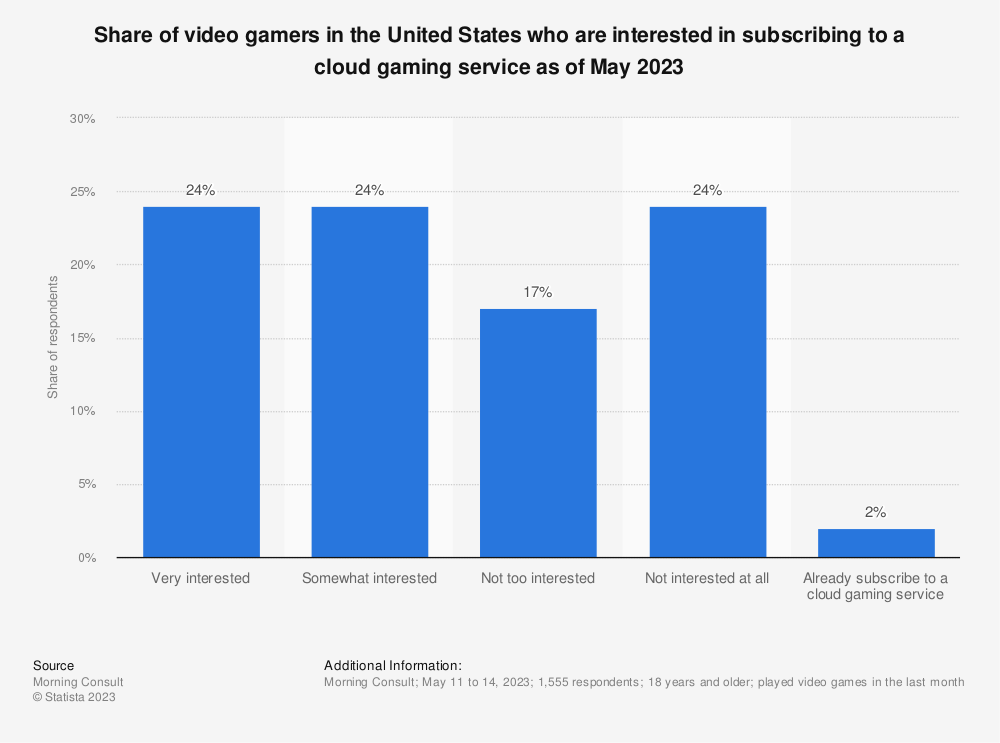 在过去的几年里,消费者对云游戏的认知度显著提高。截至2022年4月,43%的美国在线用户知道云游戏,高于2020年11月的14%。据报道,英国和德国也有类似的兴趣水平。2023年初的另一项调查发现,24%的美国玩家对订阅云游戏服务非常感兴趣,另外24%的人至少对这样做有点兴趣。总的来说,专门订阅云游戏服务的玩家比例仍然低于一般支付视频游戏订阅费的玩家比例。