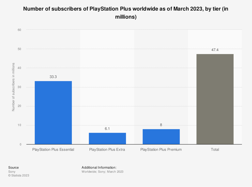截至2023年3月,PlayStation Plus全球各层级用户数量(百万)。数据来源:Statista.com