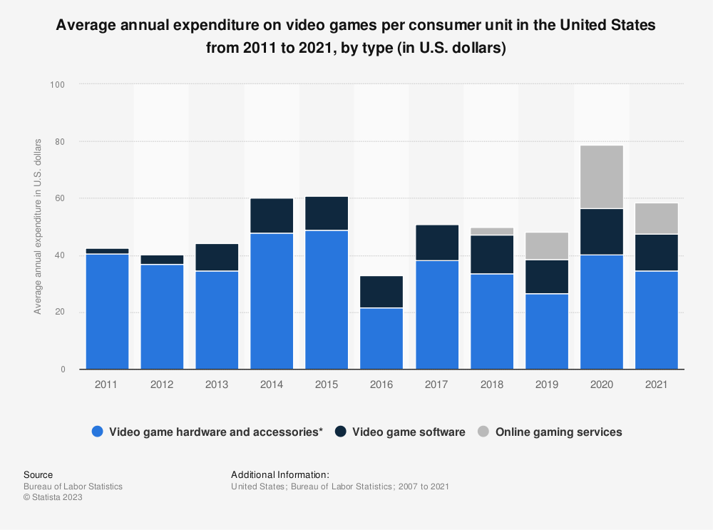 2011年至2021年美国每消费者单位在电子游戏上的平均年支出(按类型划分)。数据来源:Statista.com