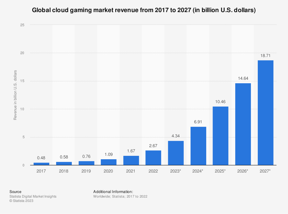 云游戏指的是视频游戏流,它允许玩家通过在线连接在自己的设备上玩游戏,而不需要专门的游戏硬件或在本地安装游戏。云游戏可以让电子游戏变得更容易获得,因为现代图像密集型游戏需要专门的游戏pc或游戏机,这通常很昂贵,而且硬件空间也大多有限,除非手动升级。到2027年,全球云游戏市场的收入预计将达到187.1亿美元,比2022年的43.4亿美元有所增长。