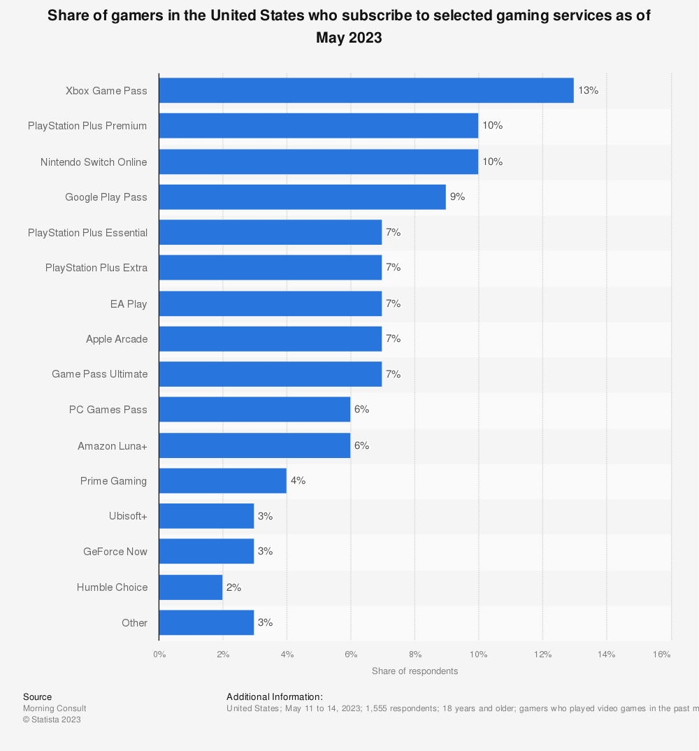截至2023年5月,美国订阅特定游戏服务的玩家比例。数据来源:Statista.com
