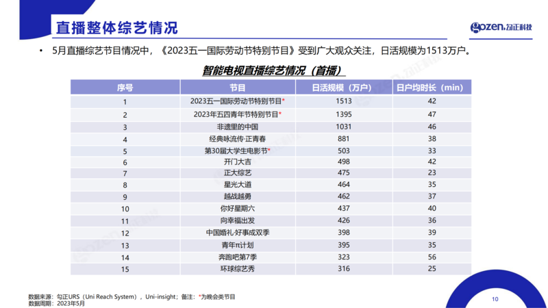 直播综艺(首播):中华全国总工会和中央广播电视总台共同举办的《2023五一国家劳动节特别节目》,日活规模达到1,513万户。