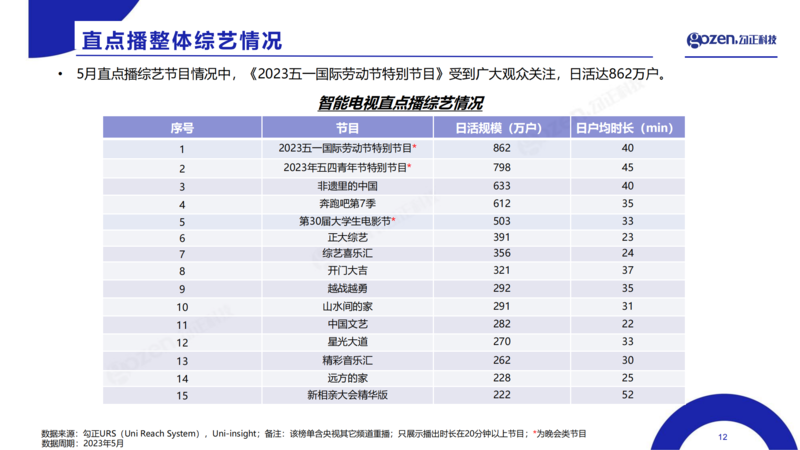 直点播综艺:中华全国总工会和中央广播电视总台共同举办的《2023五一国家劳动节特别节目》,日活规模达到862万户。
