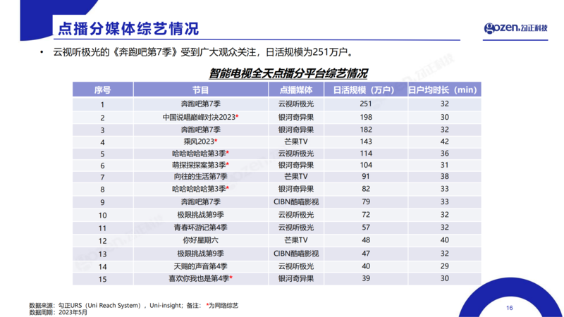 点播综艺分平台:云视听极光的户外竞技真人秀《奔跑吧第7季》,日活规模达到251万户。