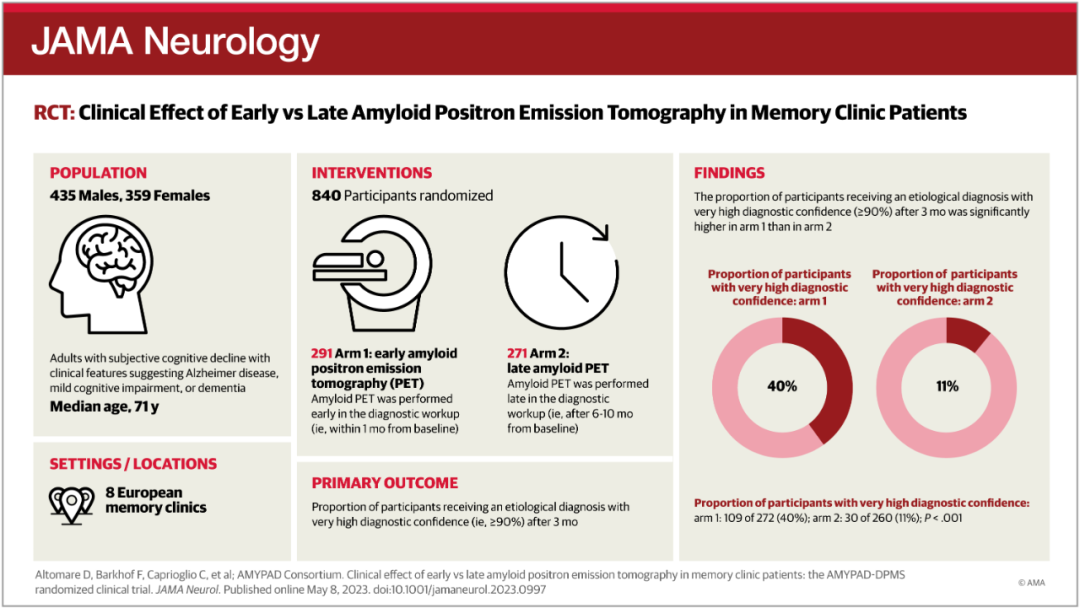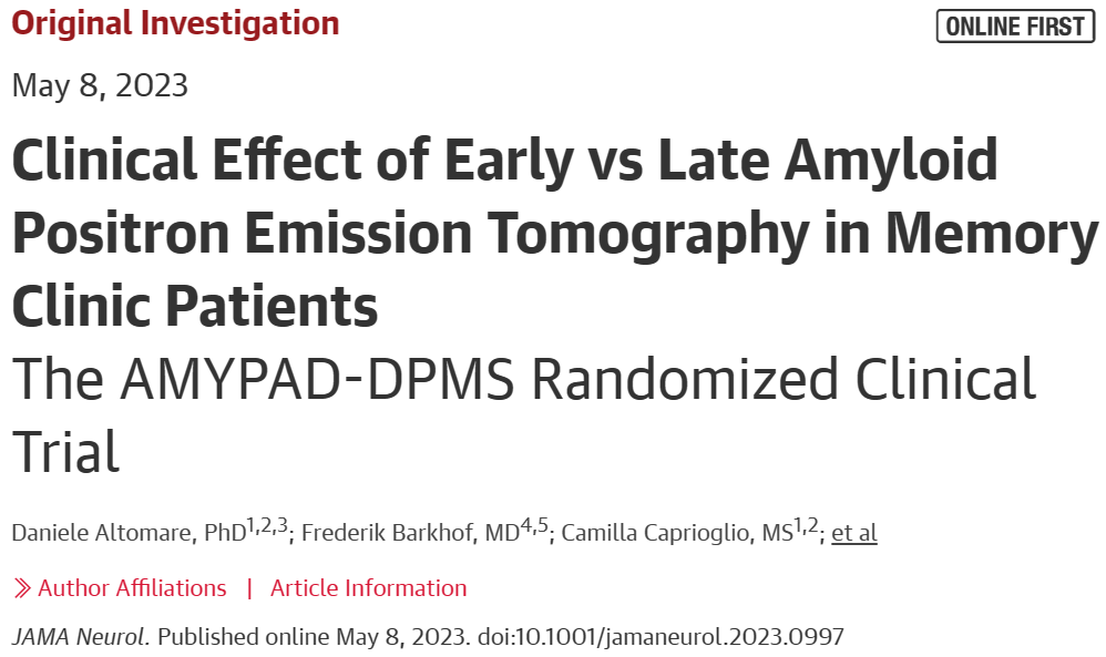 [1] Altomare D, Barkhof F, Caprioglio C, et al. Clinical Effect of Early vs Late Amyloid Positron Emission Tomography in Memory Clinic Patients: The AMYPAD-DPMS Randomized Clinical Trial. JAMA Neurol. Published online May 08, 2023. doi:10.1001/jamaneurol.2023.0997