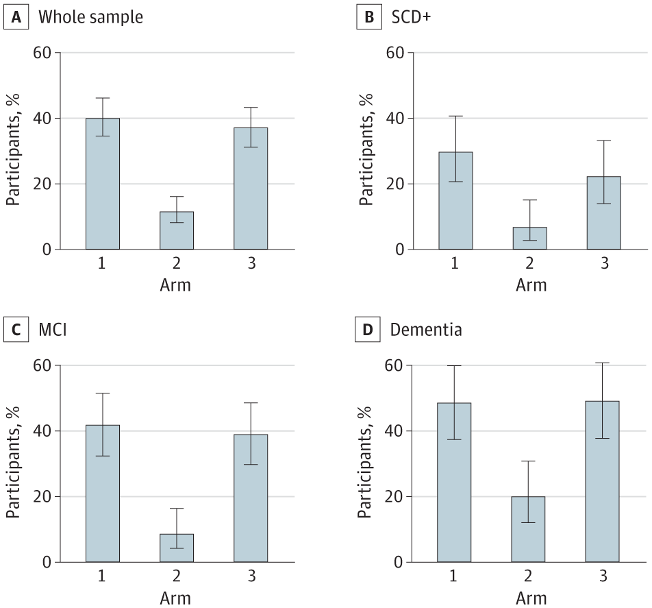 在所有参与者中,794例完成了3个月的随访,因此纳入了主要结局的分析,基线时,99%(785/794)的参与者接受了MRI或CT,99%(788/794)接受了认知筛查(简易精神状况检查,MMSE)。部分参与者在3个月内接受了脑脊液、FDG-PET、多巴胺转运蛋白扫描(DaTscan)或脑电图等的诊断检查,三组间的比例没有显著差异。