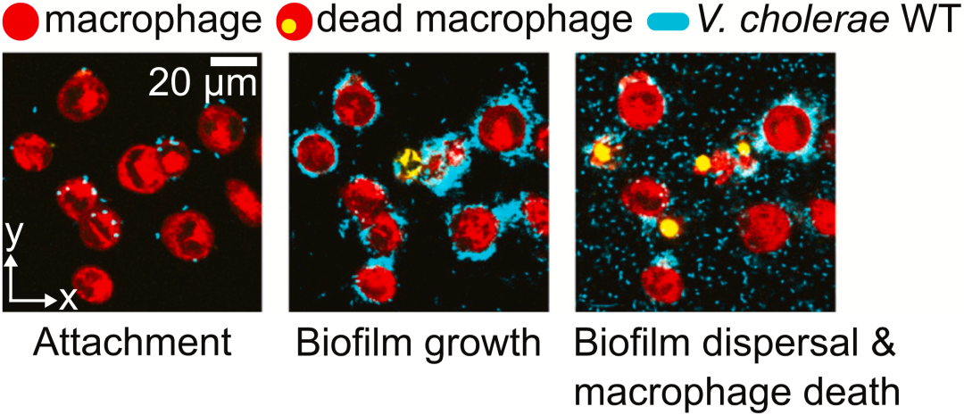 在确定HlyA是霍乱弧菌杀死巨噬细胞的主要毒素之后,Drescher团队发现HlyA与生物膜的配合是霍乱弧菌的杀手锏。生物膜越厚,HlyA就越难穿越生物膜,这就造成了一个局部HlyA浓度超高的环境,最终毒死了被生物膜包围的巨噬细胞。