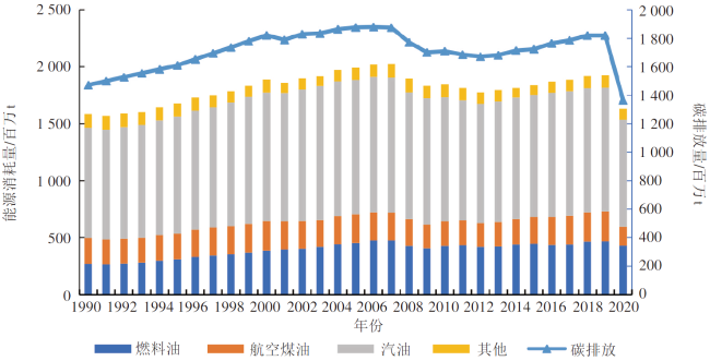 图2 美国交通运输领域能耗量和碳排放量(1990-2020年)