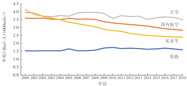 美国交通运输领域单位能耗较高,但近些年呈现下降趋势。图3所示为2000-2018年,美国不同客运方式单位能耗变化情况。美国私家车以大排量车型为主,但随着电动车、插电式混合动力车和油电混合动力车销量的增长,其单耗呈现下降趋势。航空业通过减重、停飞油耗过高的飞机、规定旅客为第二件行李缴费等措施降低油耗,实现单耗逐年下降。公交车单耗呈现5年的周期性波动,考虑到公交车换车的周期为5年,美国公交车单耗周期性波动与换车周期基本吻合,平均单耗略有下降。美国拥有便捷的高速公路网和民航网,其居民出行更多地依靠私家车和民航飞机,同时美国铁路设施逐渐老化,导致美国铁路运输单位能耗逐年上升。