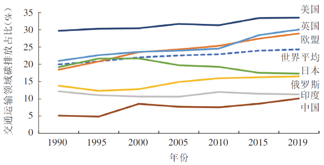 应对气候变化是全球各国面临的共同挑战。交通运输领域在发展过程中需消耗大量的能源,并造成大规模的二氧化碳排放(简称“碳排放”),据世界银行统计,2019年交通运输领域的石油消耗量约占全球所有产业的70%。作为全球各国最基础的产业之一,交通运输业产生的碳排放量约占全球碳排放量的24%左右(数据来源于世界银行),其同时也是近年来碳排放增长最快的行业。图1所示为部分国家和地区交通运输领域碳排放占各自总碳排放的比例,可以看出,我国交通运输碳排放占比从2005年的7.2%增加到2019年的10%左右,且目前仍处在增长阶段。为实现“双碳”目标,我国交通运输业需探索绿色低碳转型道路。全球已有50多个国家和地区实现了碳达峰,美国、日本、欧盟等国家和地区已在低碳交通方面取得了显著成就,分析其交通运输领域碳排放特点、规律,梳理其推进“碳达峰”“碳中和”工作的举措与经验,可为我国交通运输业的低碳发展提供借鉴和启示。