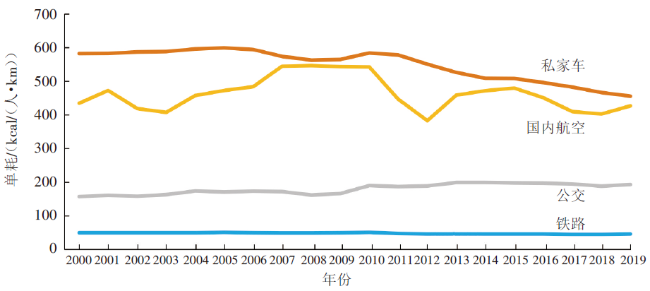 图4 日本不同客运方式单位能耗变化情况(2000-2019年)