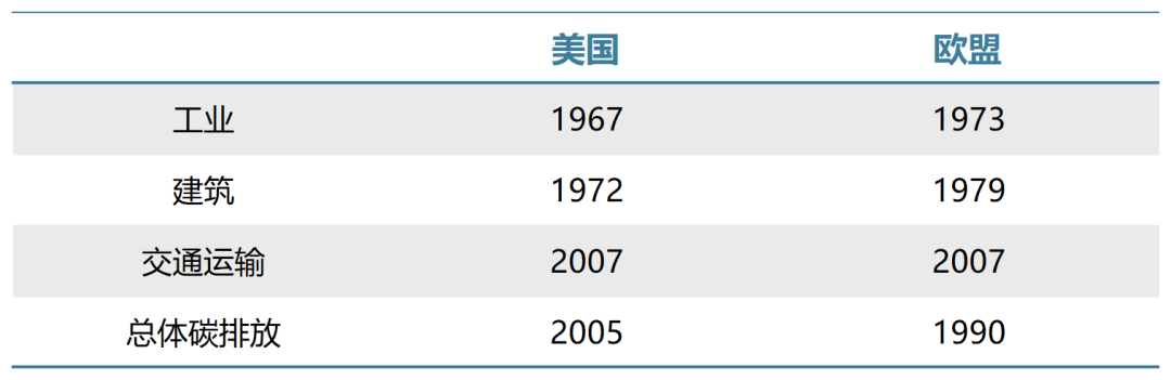表1 美国和欧盟的工业、建筑、交通运输领域碳达峰年份