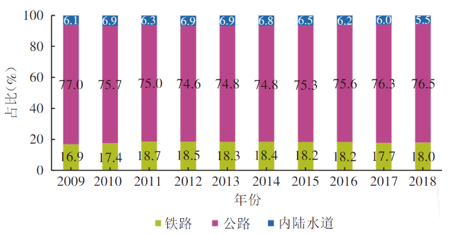 图7 欧盟不同的货运方式占比(2009-2018年)