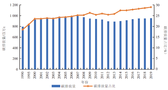 图6 欧盟交通运输领域碳排量及其占比情况(1990-2019年)