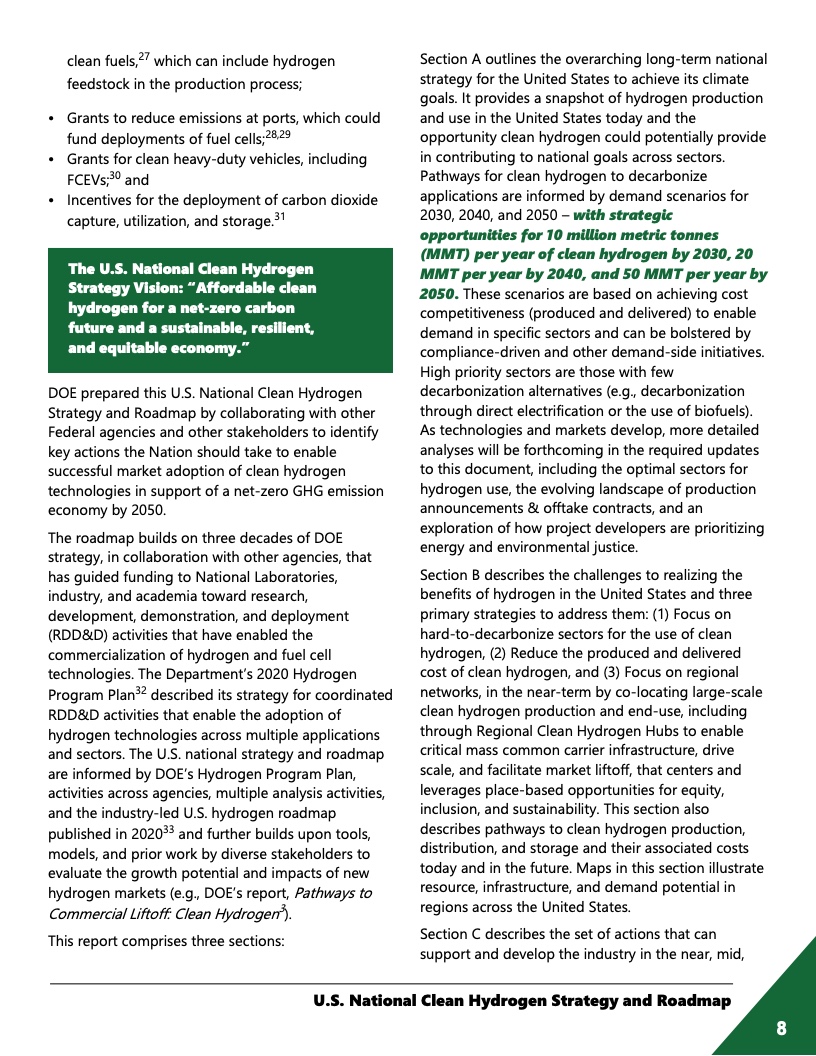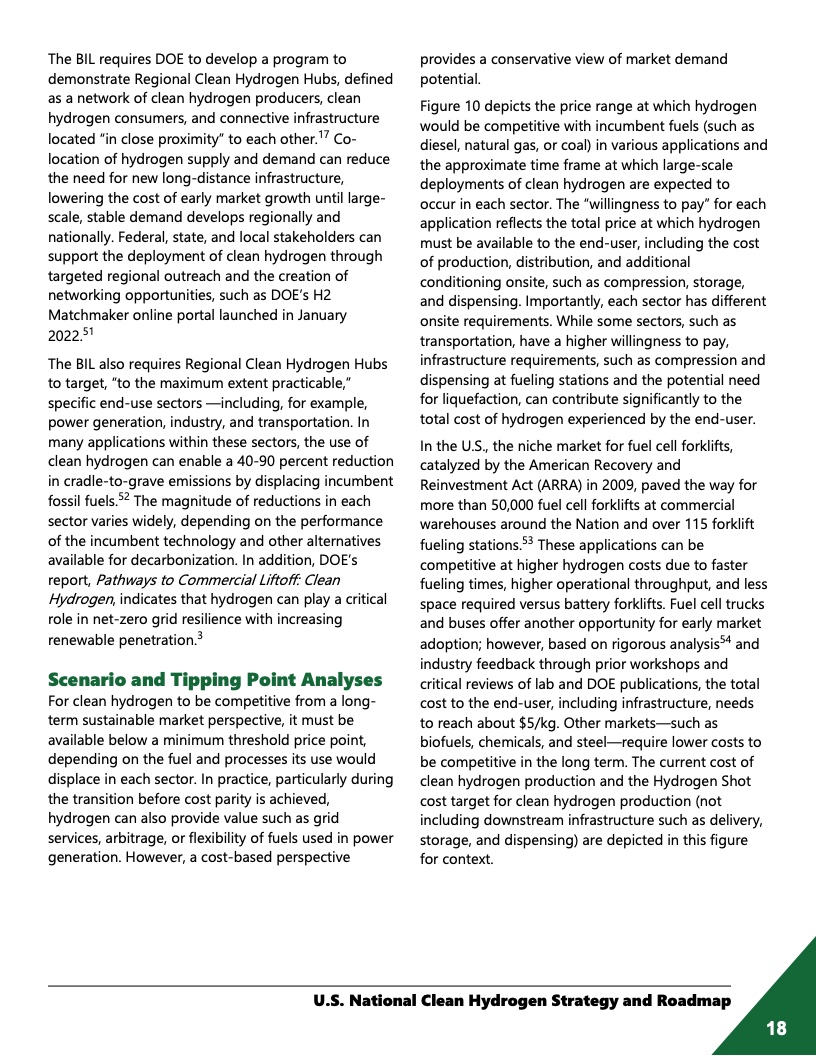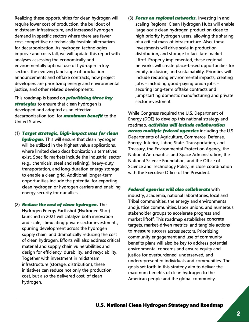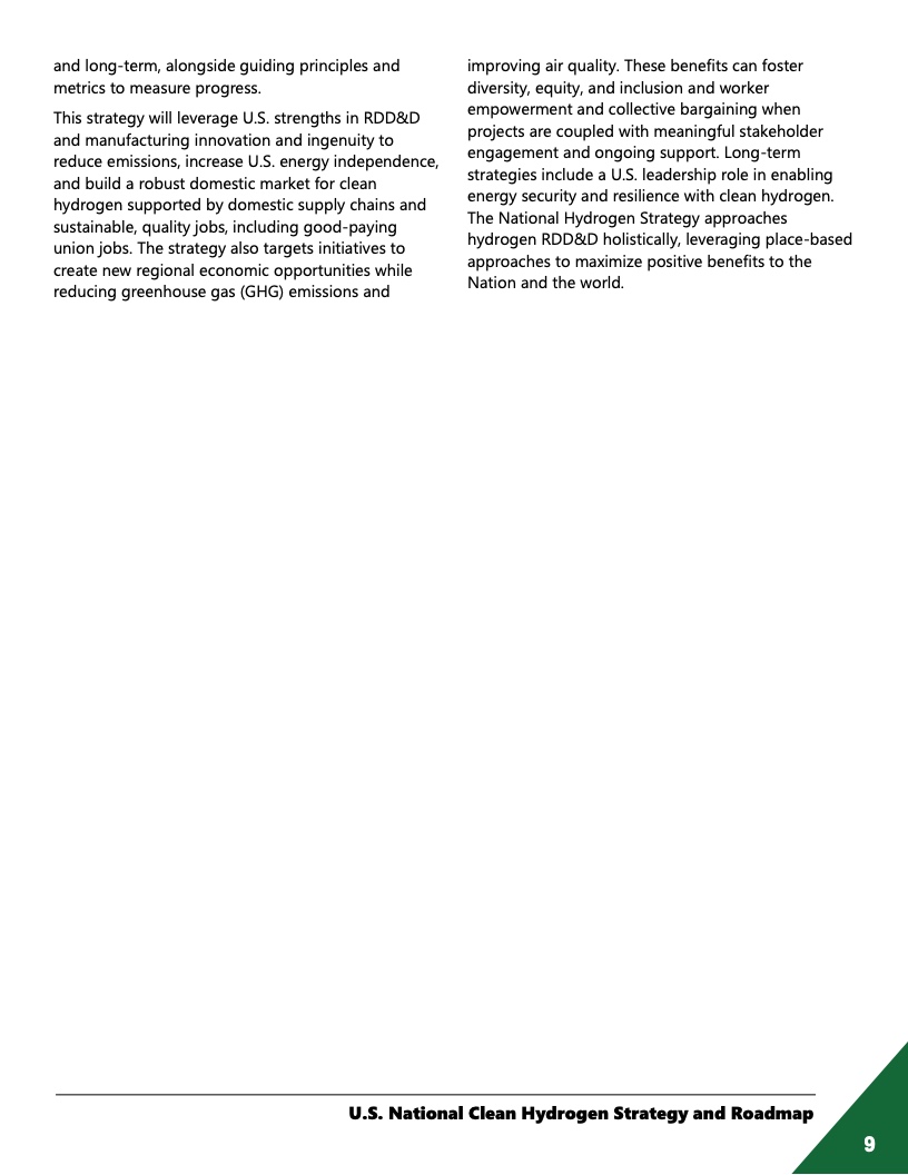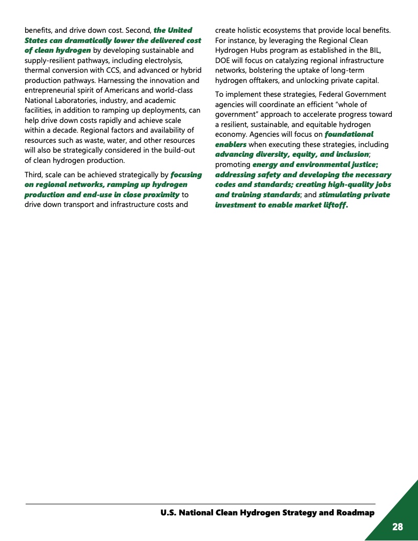 关注区域氢能网络。投资和扩大区域清洁氢中心,确保在重点氢能用户附近能够进行大规模清洁氢生产,共享基础设施。此外,这些投资将推动实现大规模的氢能生产、分配和存储,以促进市场发展。如果实施得当,这些区域氢能网络将为当地提供公平、多样化和可持续的发展机遇。优先事项将包括减少环境影响、创造就业机会、确保长期承购合同,并快速带动美国国内制造业和私人投资。