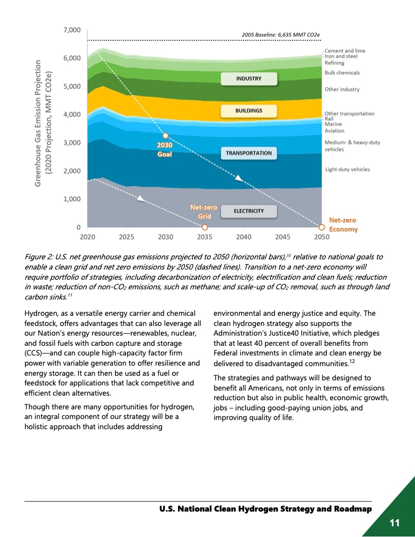 美国能源部发布了《国家清洁氢能战略和路线图》(U.S. National Clean Hydrogen1 Strategy and Roadmap)。据估计,到2030年,美国可实现清洁氢产量1,000万吨/年,同时将增加10万个就业机会;到2040年、2050年分别增至2,000万吨/年和5,000万吨/年。实现清洁氢能的商业化部署,建设强大的清洁能源经济是拜登总统“投资美国”(Investing in America)议程的一个关键组成部分,对美国实现长期脱碳目标至关重要。