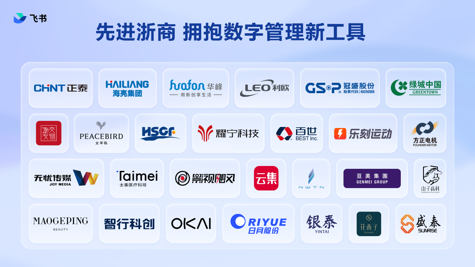 浙江是民营经济大省,更是数字化改革的前沿阵地,飞书为量大面广的浙江民营企业实现管理数字化、成本最优化、效率最大化提供了新的可能。通过飞书这样的数字化管理工具,一批浙商正在拥抱新兴的数字化管理模式,其中不仅包括正泰、海亮、华峰、利欧等制造500强企业,绿城、银泰等大型集团,也包括太平鸟、交个朋友、毛戈平等数字消费品牌代表。
