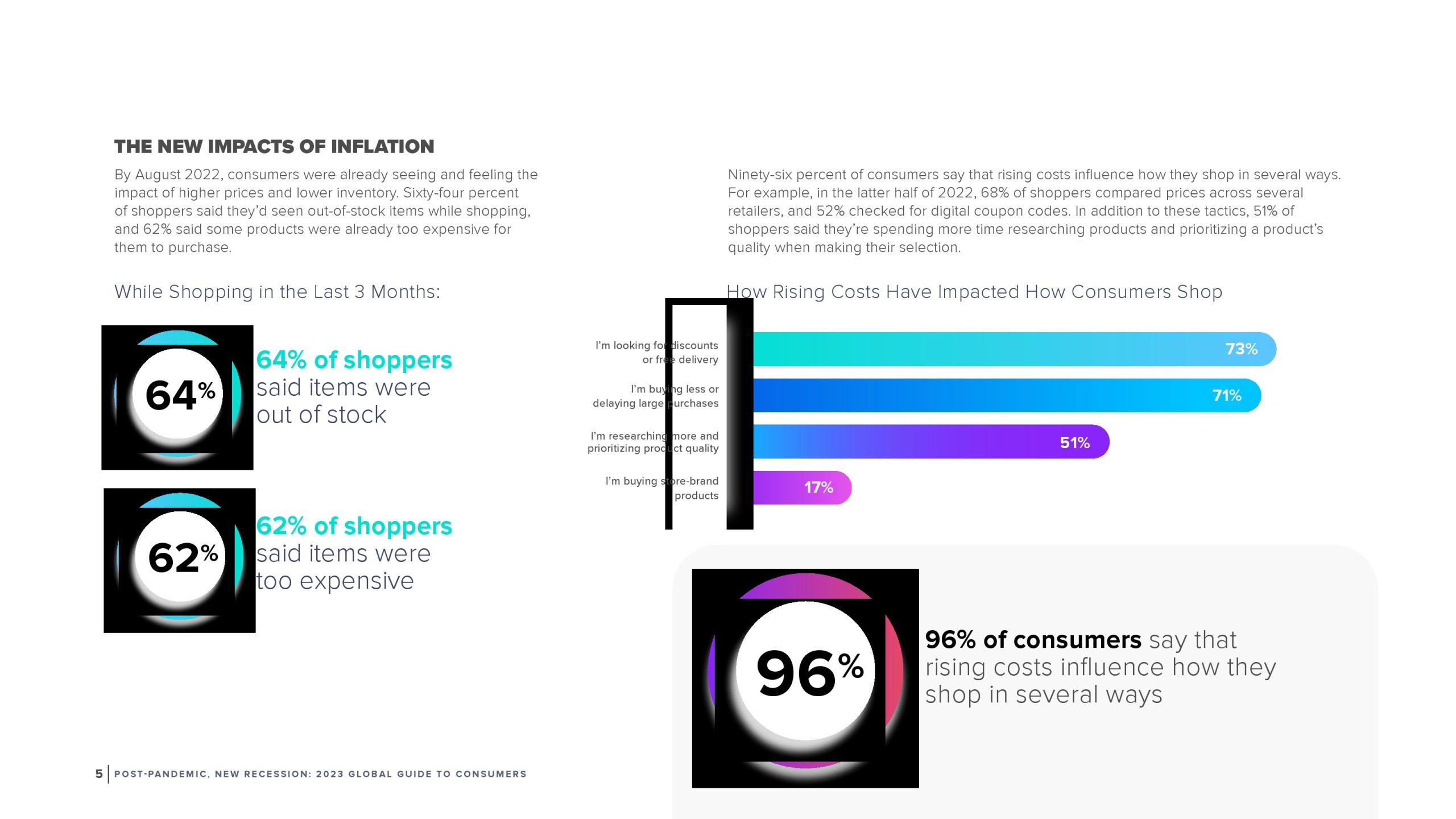 近一半的购物者优先考虑产品质量,大多数人正在寻找折扣,购买更少的产品,或者推迟大宗购买。他们研究产品,以找出在成本上升的时代该买什么。