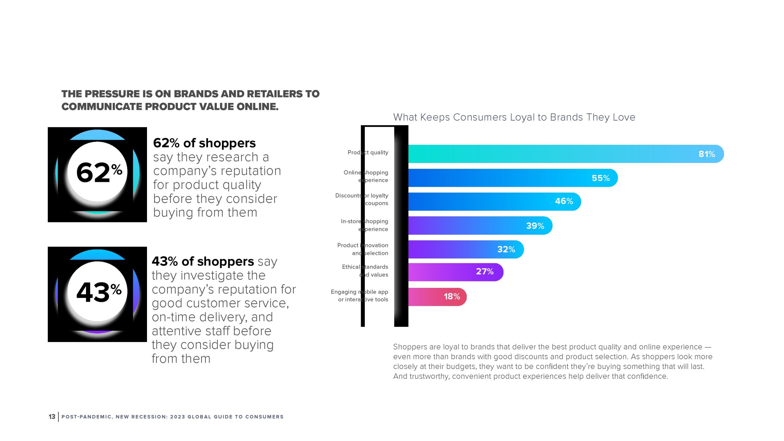 数据显示,消费者对提供最佳产品质量和在线体验的品牌非常忠诚。但是,不到1/4的消费者表示,移动应用程序或数字购物助手等互动工具有助于赢得他们的忠诚度。