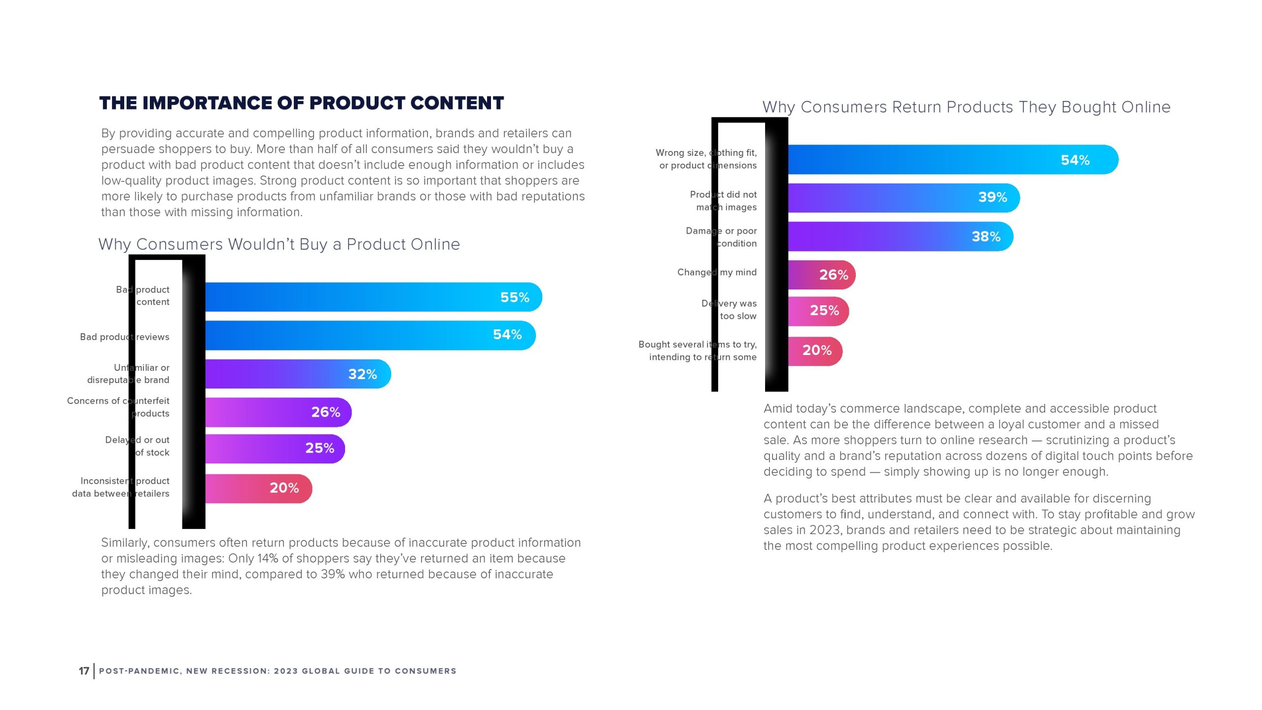 当询问购物者在网上购买服装、杂货、工具和硬件以及家具时,他们看重的是什么。在为消费者创造最好的产品体验时,品牌和零售商应该考虑消费者可能面临的问题,并精心制作产品细节来回答这些问题。