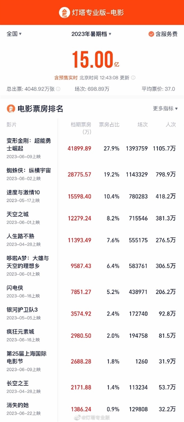 目前暑期档上映的影片中,《变形金刚:超能勇士崛起》以4.18亿的成绩独占鳌头,票房占比达27.9%,与第二名拉开了明显差距。