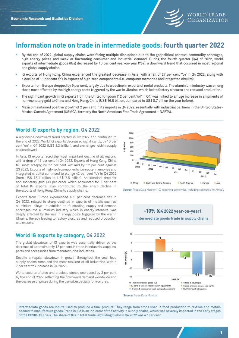中间产品指的是用于生产最终产品的投入,是衡量全球供应链活动的一个指标。全球范围内中间产品出口的下降趋势从2022年第二季度开始,一直持续到第四季度。此外,在2022年第四季度,中间产品在贸易总额(不包括燃料)中的份额略微下降到47%,低于一年前同一季度的51%和过去十年50%的平均比例。