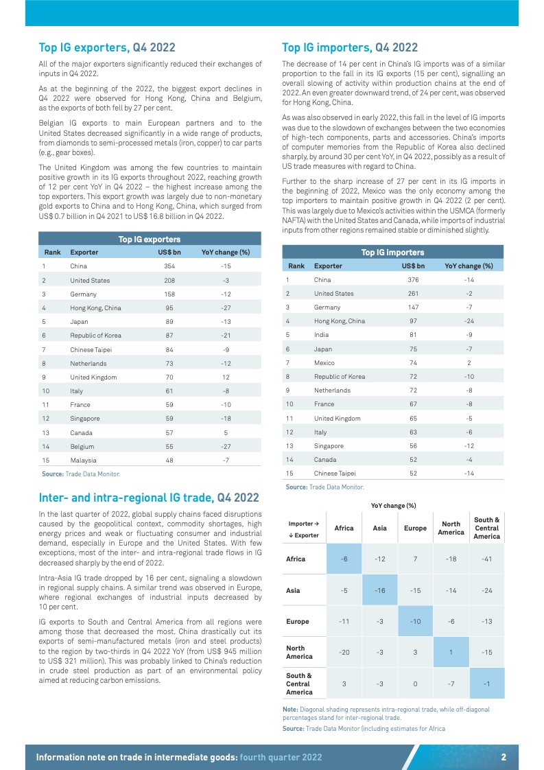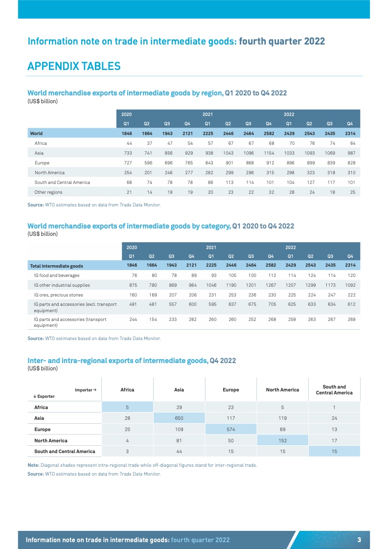 全球中间产品出口的减少可部分归因于 “零部件(不包括运输设备)”和 “其他工业用品 “产品类别,它们在2022年第四季度分别同比下降了13%和14%。同时,世界矿石和宝石的出口下降了3%,反映了世界范围内的需求下降和价格下降,特别是铁矿石的下降。相比之下,食品供应链仍然具有弹性,”食品和饮料 “产品类别的中间产品出口增长了7%。