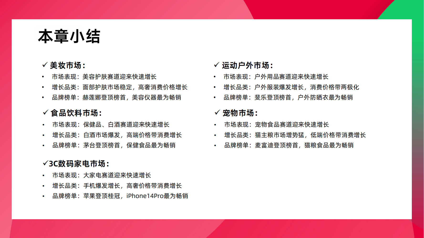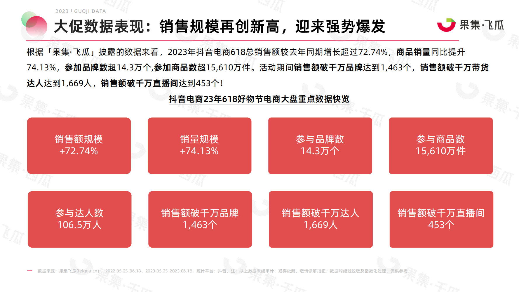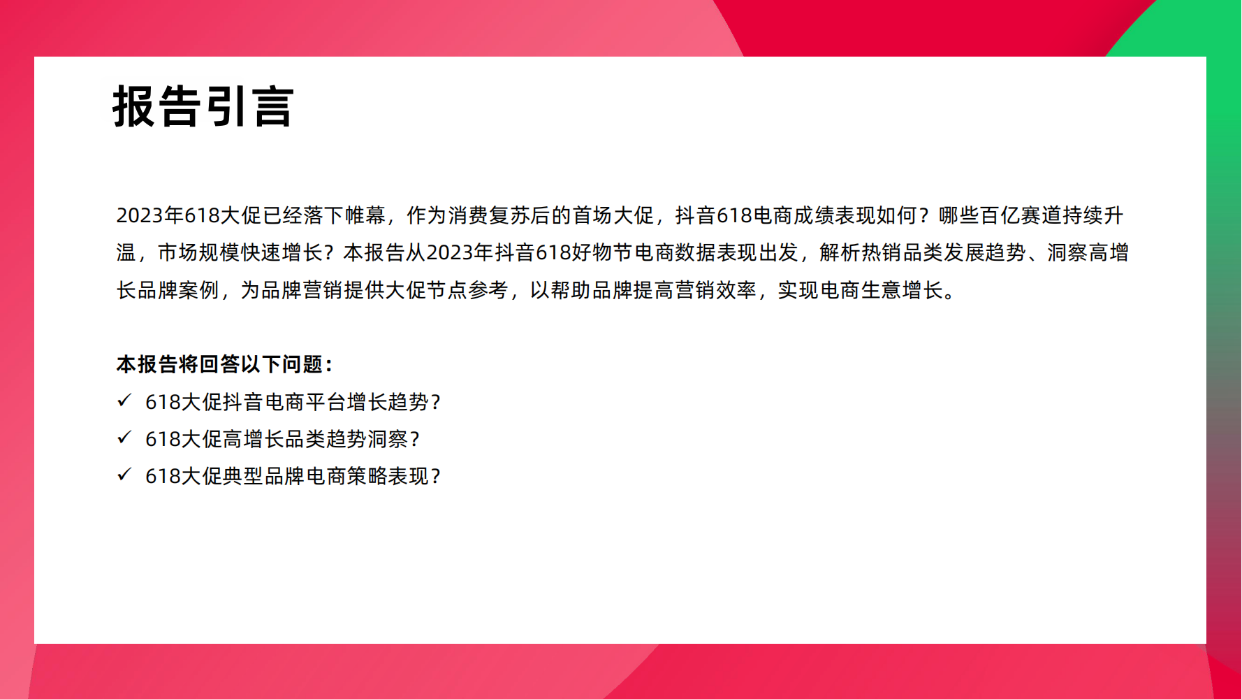 2023年618大促已经落下帷幕,作为消费复苏后的首场大促,抖音618电商成绩表现如何?哪些百亿赛道持续升温,市场规模快速增长?本报告从2023年抖音618好物节电商数据表现出发,解析热销品类发展趋势、洞察高增长品牌案例,为品牌营销提供大促节点参考,以帮助品牌提高营销效率,实现电商生意增长。