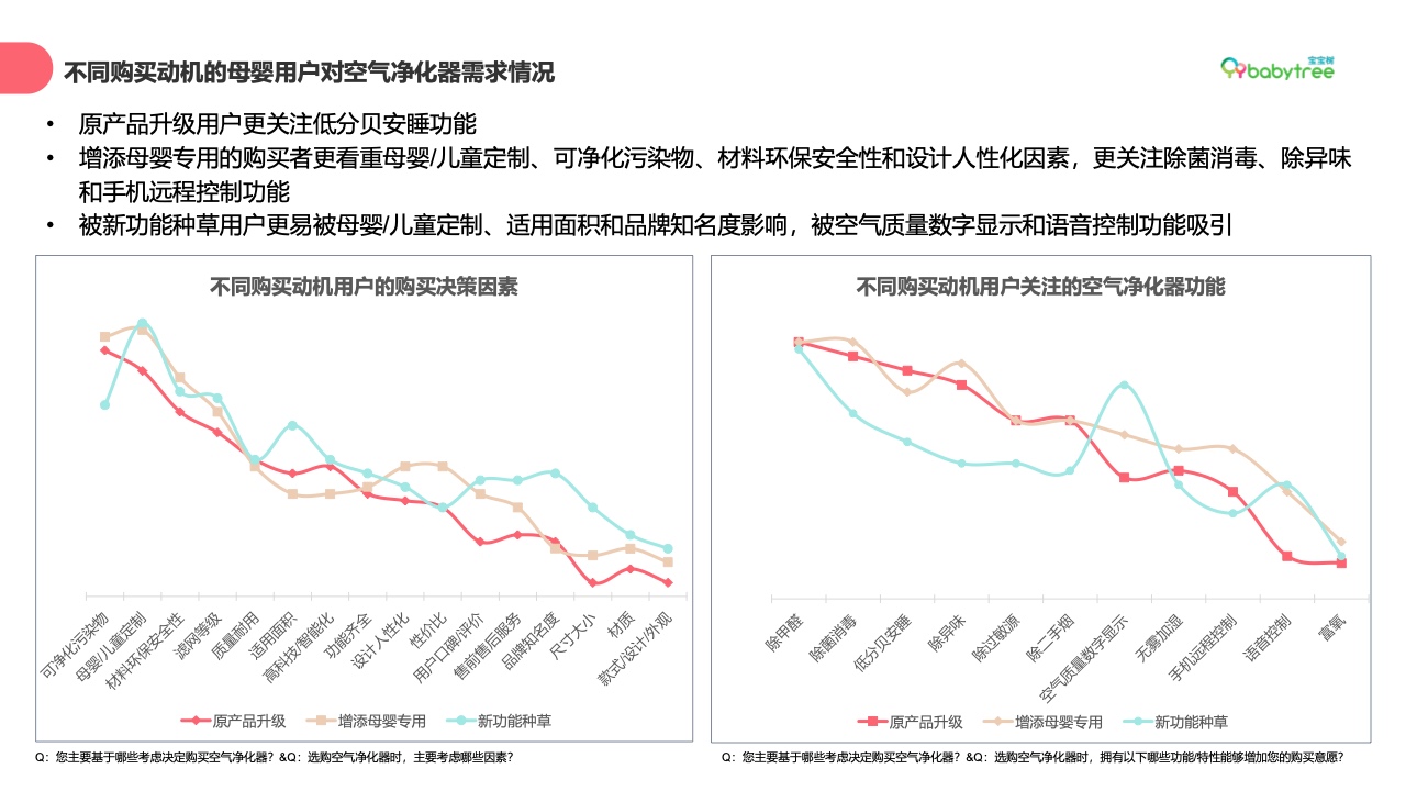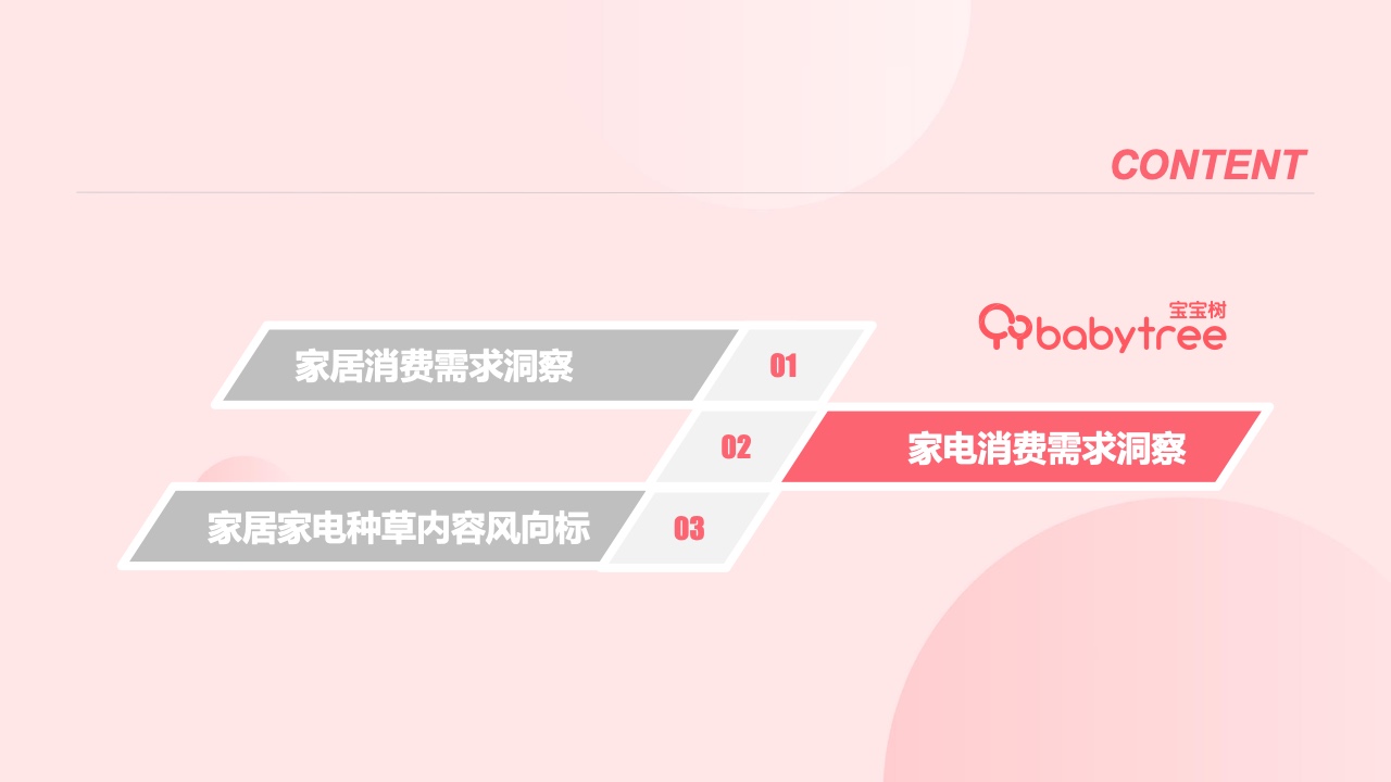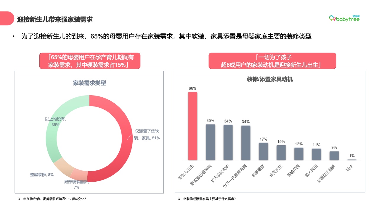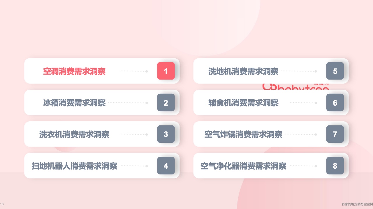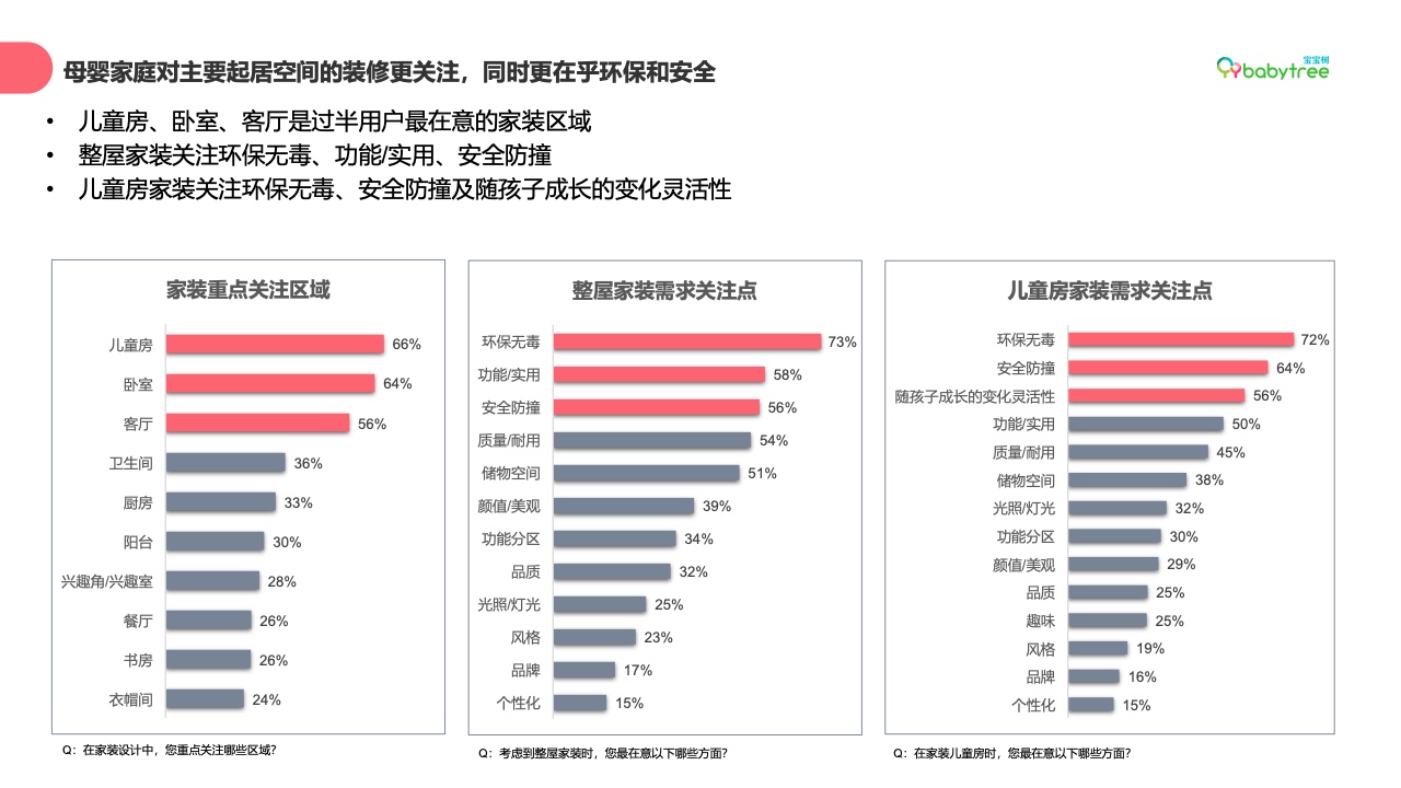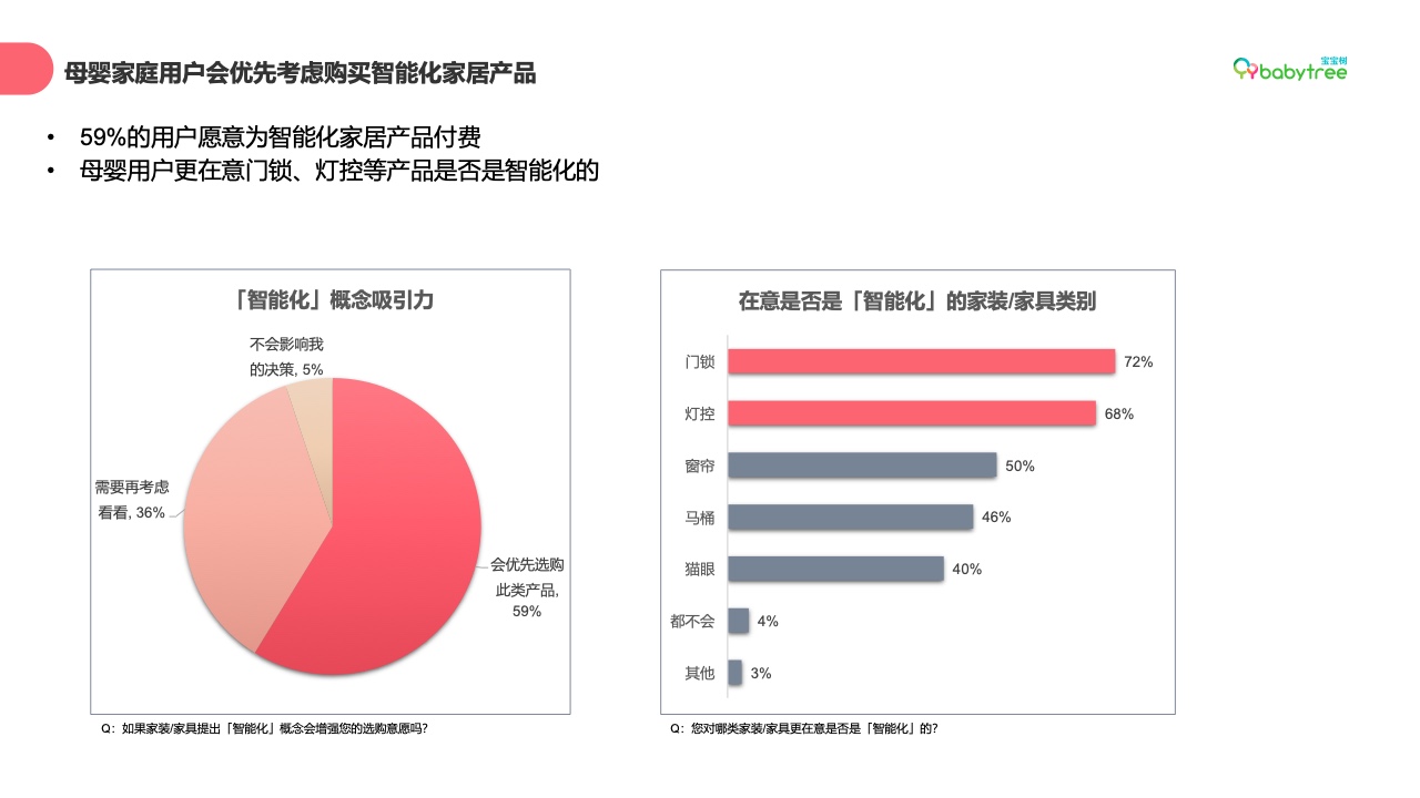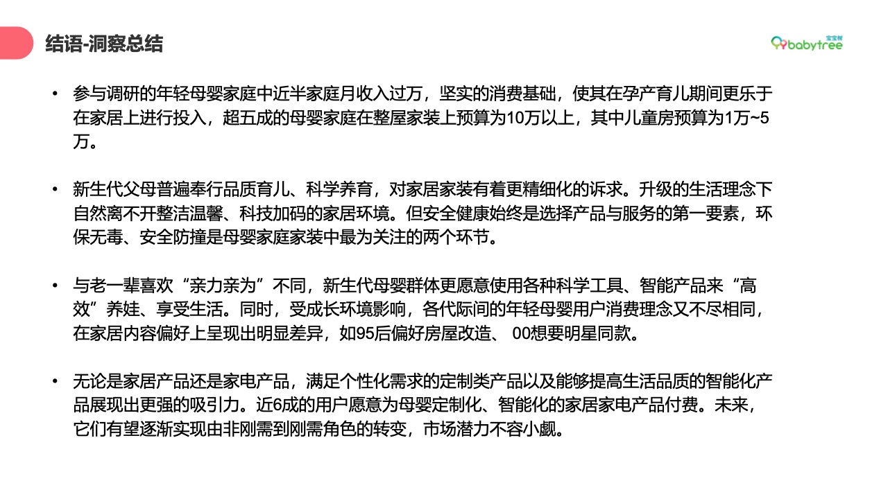 • 随着新生代用户消费水平的日益提升,其对于家庭生活品质的追求也越来越高,消费升级催生了 如绿色/环保、品质/健康、智能/便捷、功能/实用、个性/美观等多元需求。与此同时,随着孩子 的到来/即将到来、家庭生活方式的变迁,对于家庭的舒适度、安全性、功能性、便捷度等方面 有着更高的诉求。