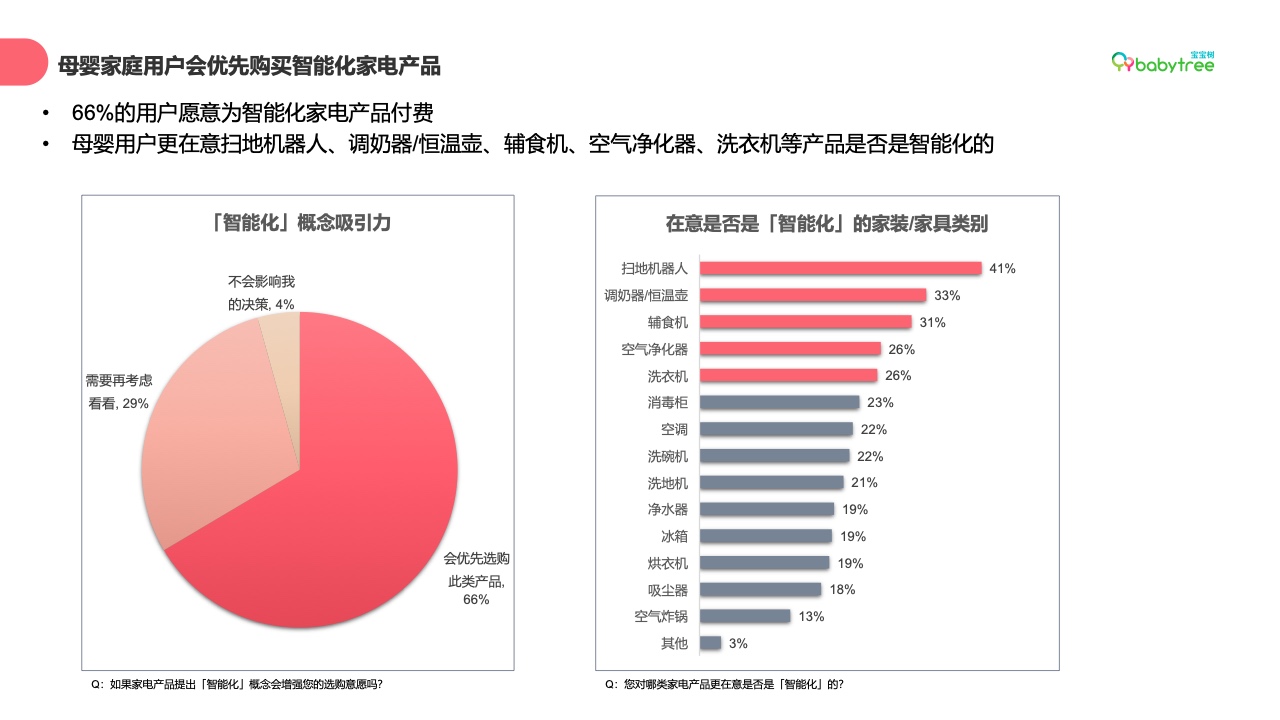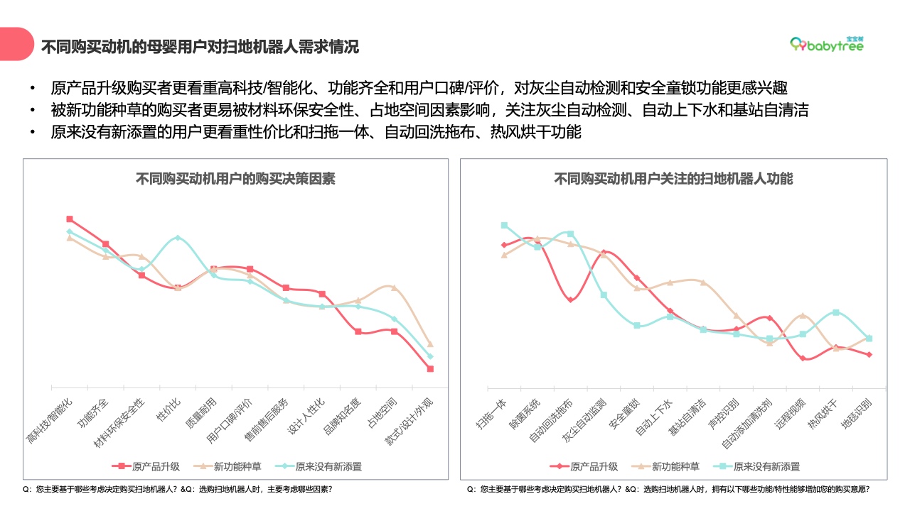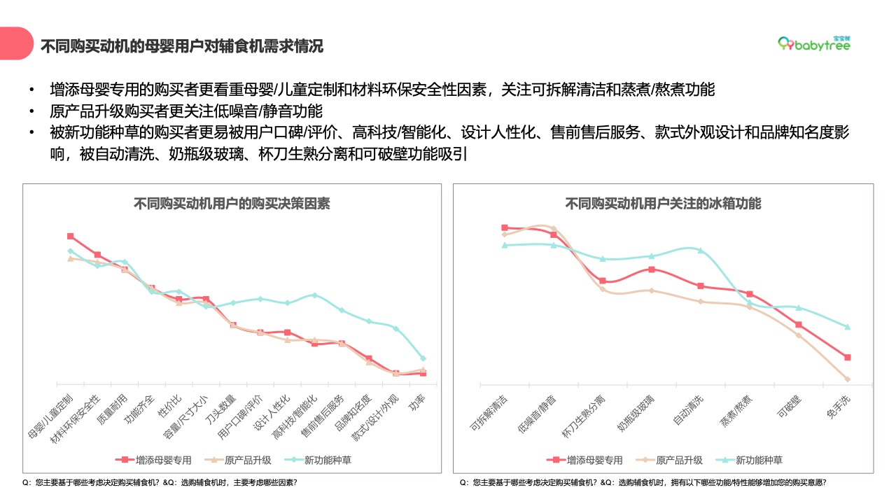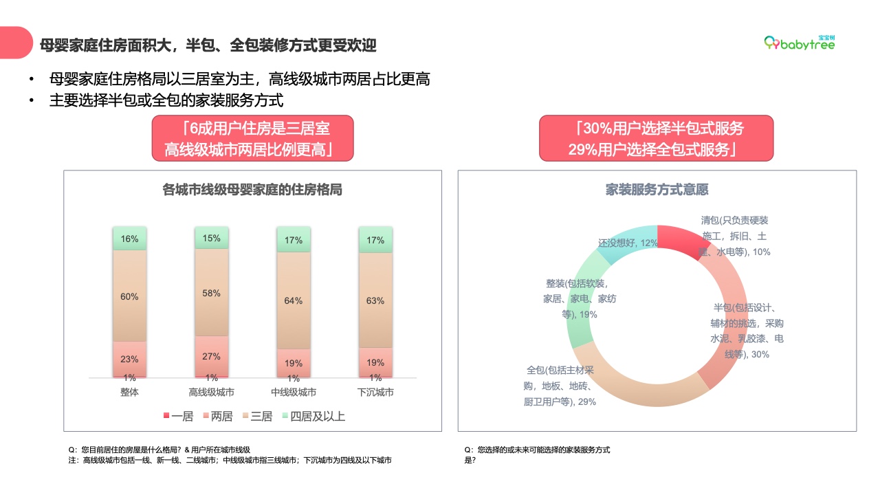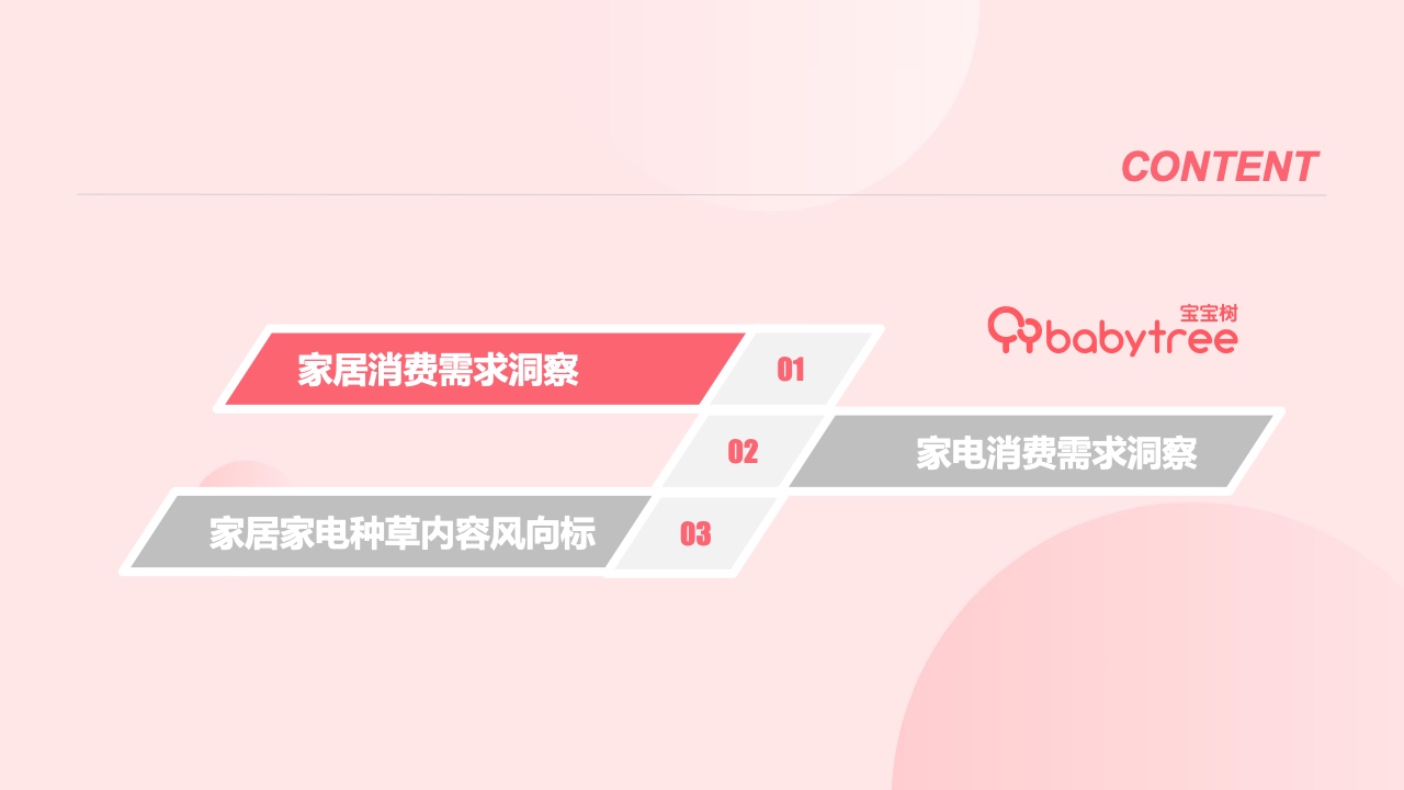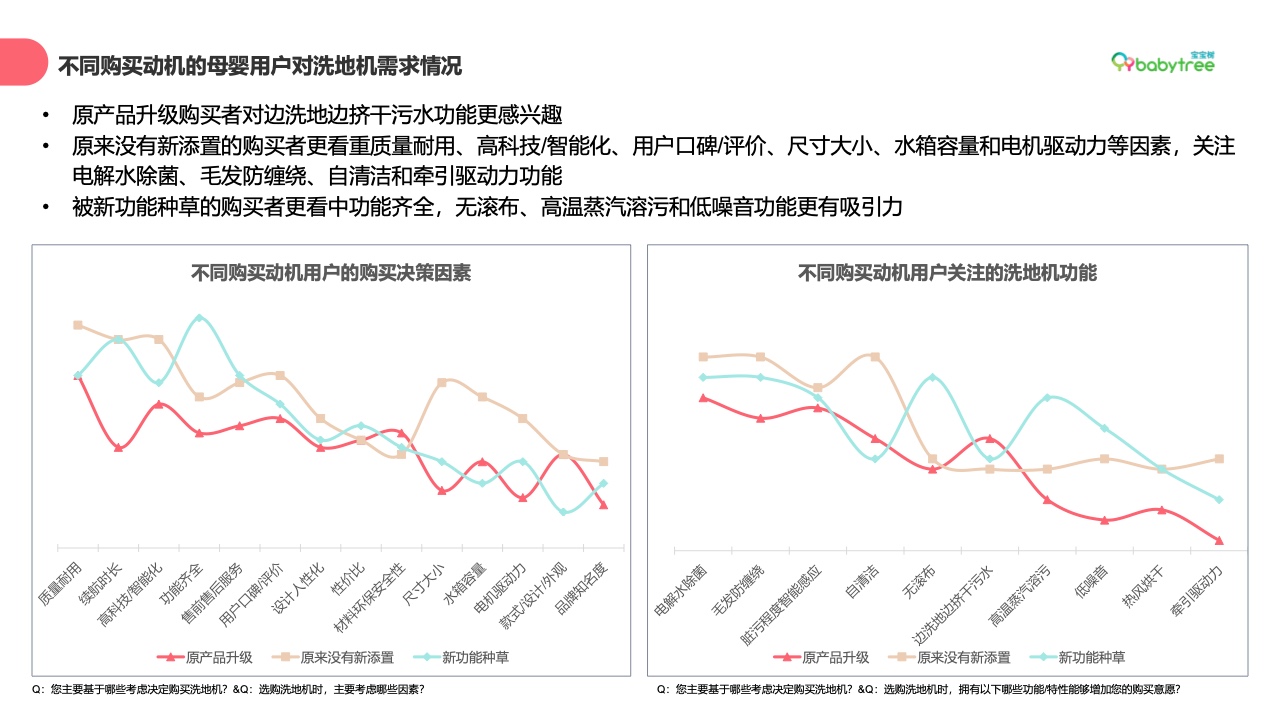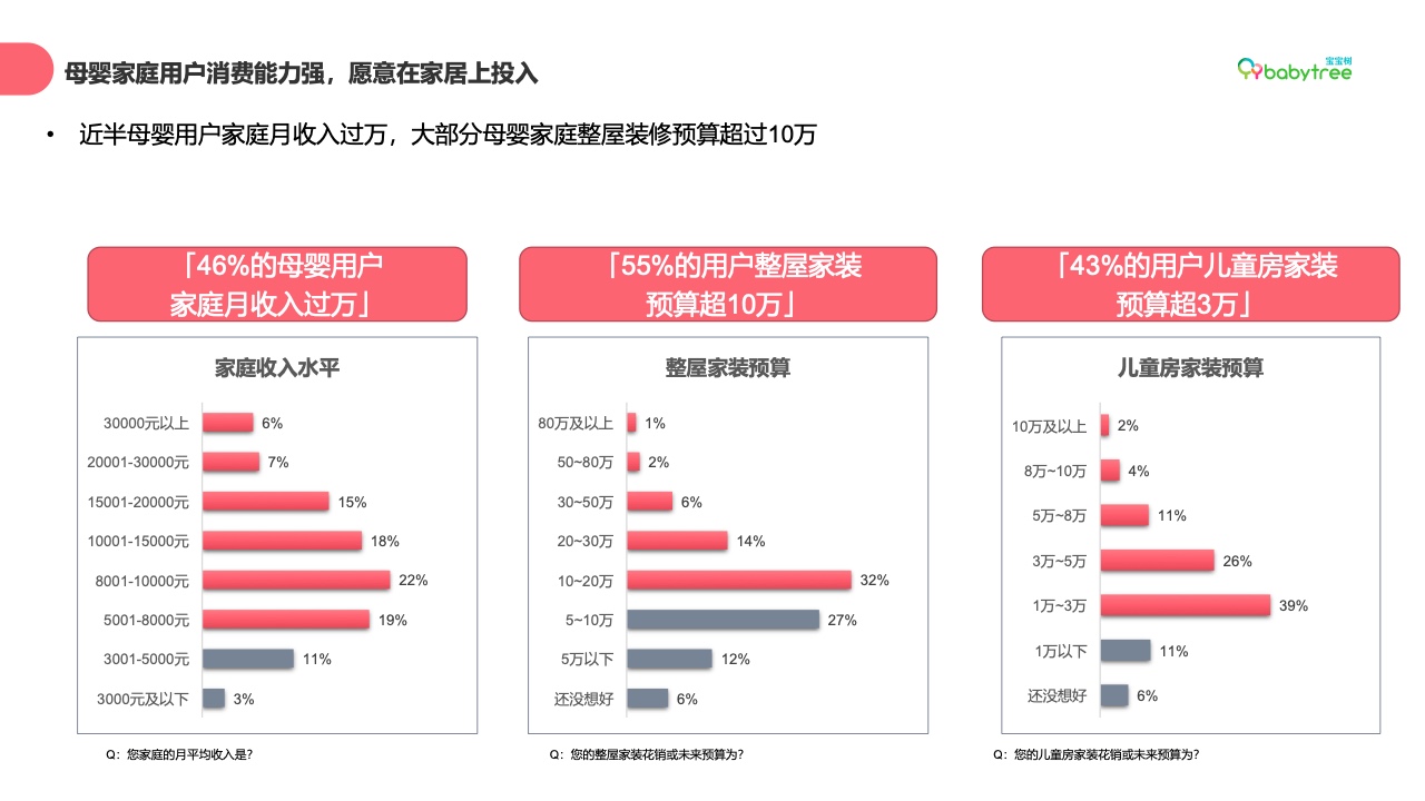 • 随着新生代用户消费水平的日益提升,其对于家庭生活品质的追求也越来越高,消费升级催生了 如绿色/环保、品质/健康、智能/便捷、功能/实用、个性/美观等多元需求。与此同时,随着孩子 的到来/即将到来、家庭生活方式的变迁,对于家庭的舒适度、安全性、功能性、便捷度等方面 有着更高的诉求。