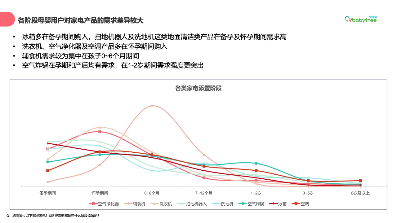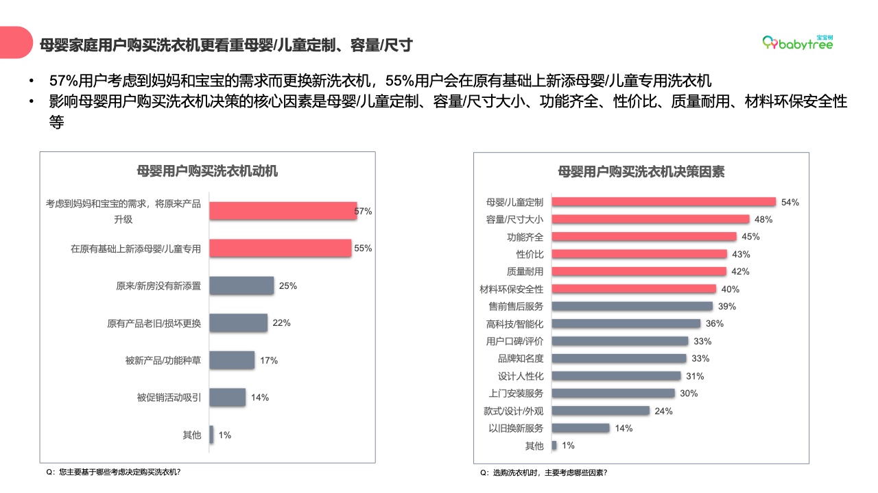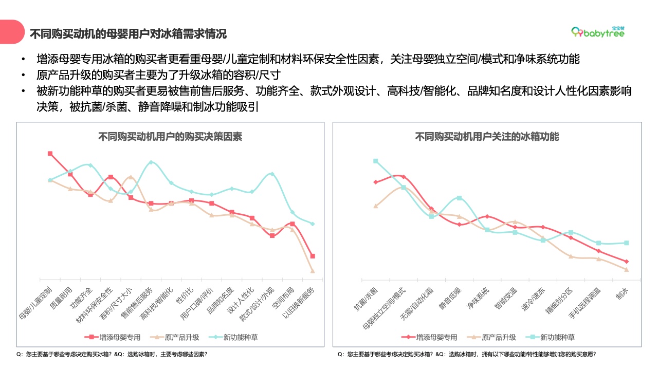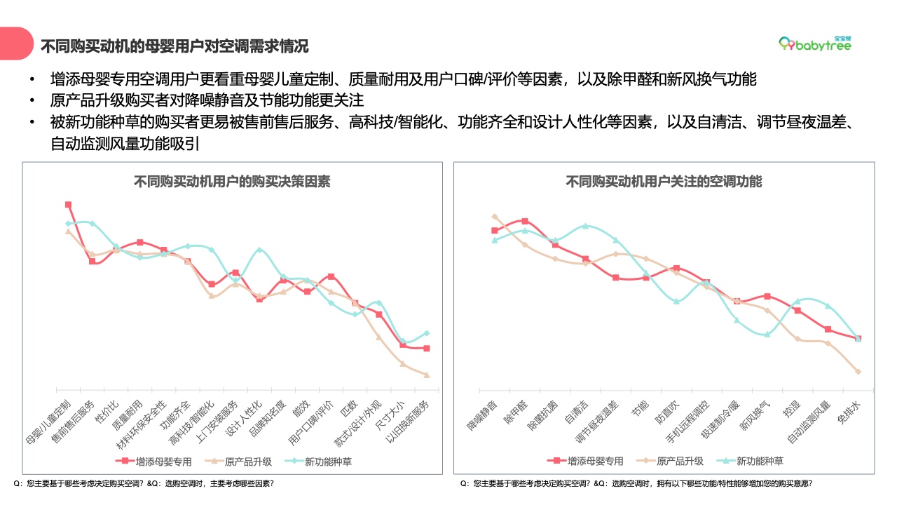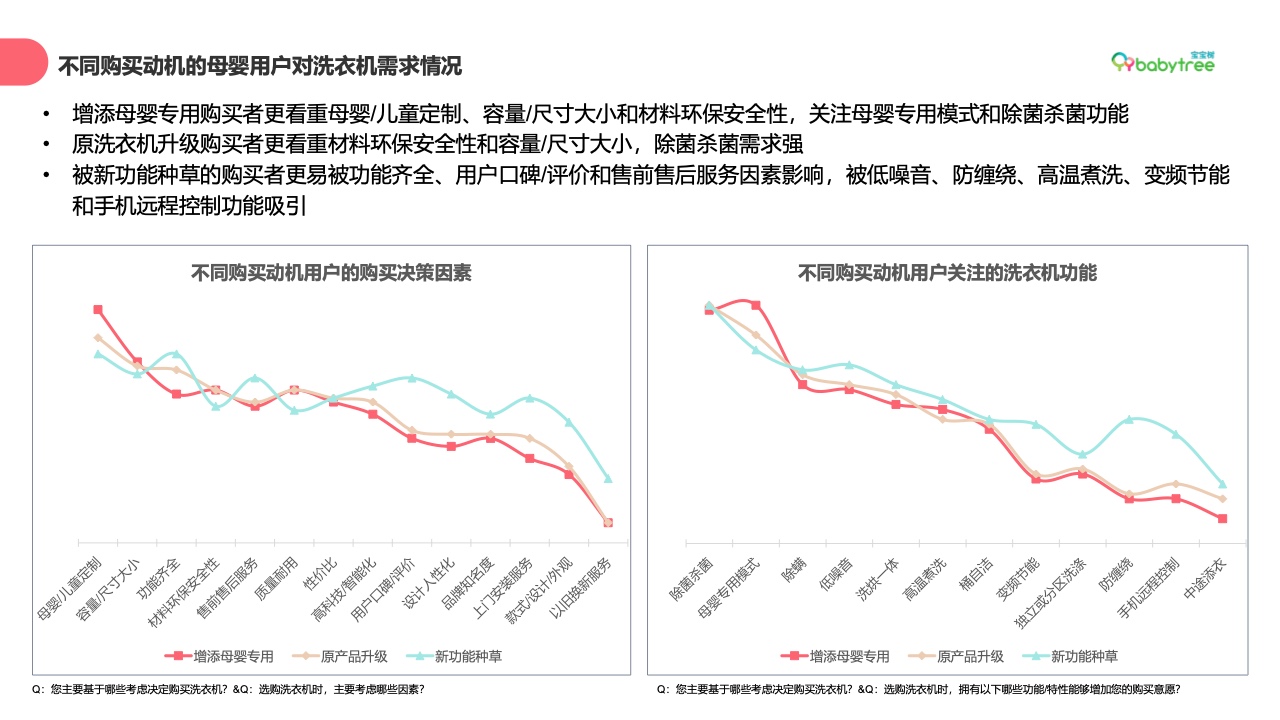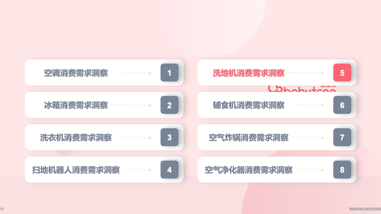 • 随着新生代用户消费水平的日益提升,其对于家庭生活品质的追求也越来越高,消费升级催生了 如绿色/环保、品质/健康、智能/便捷、功能/实用、个性/美观等多元需求。与此同时,随着孩子 的到来/即将到来、家庭生活方式的变迁,对于家庭的舒适度、安全性、功能性、便捷度等方面 有着更高的诉求。