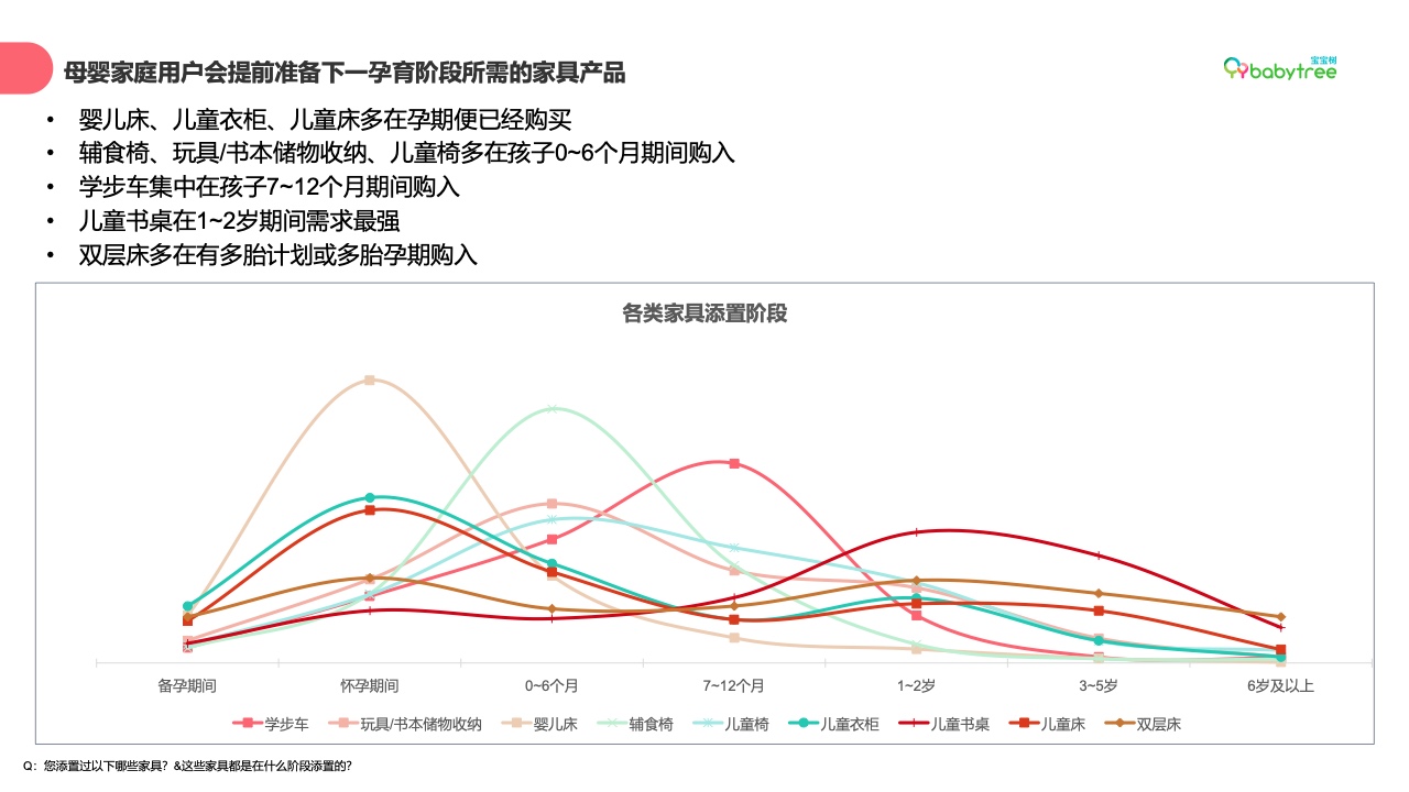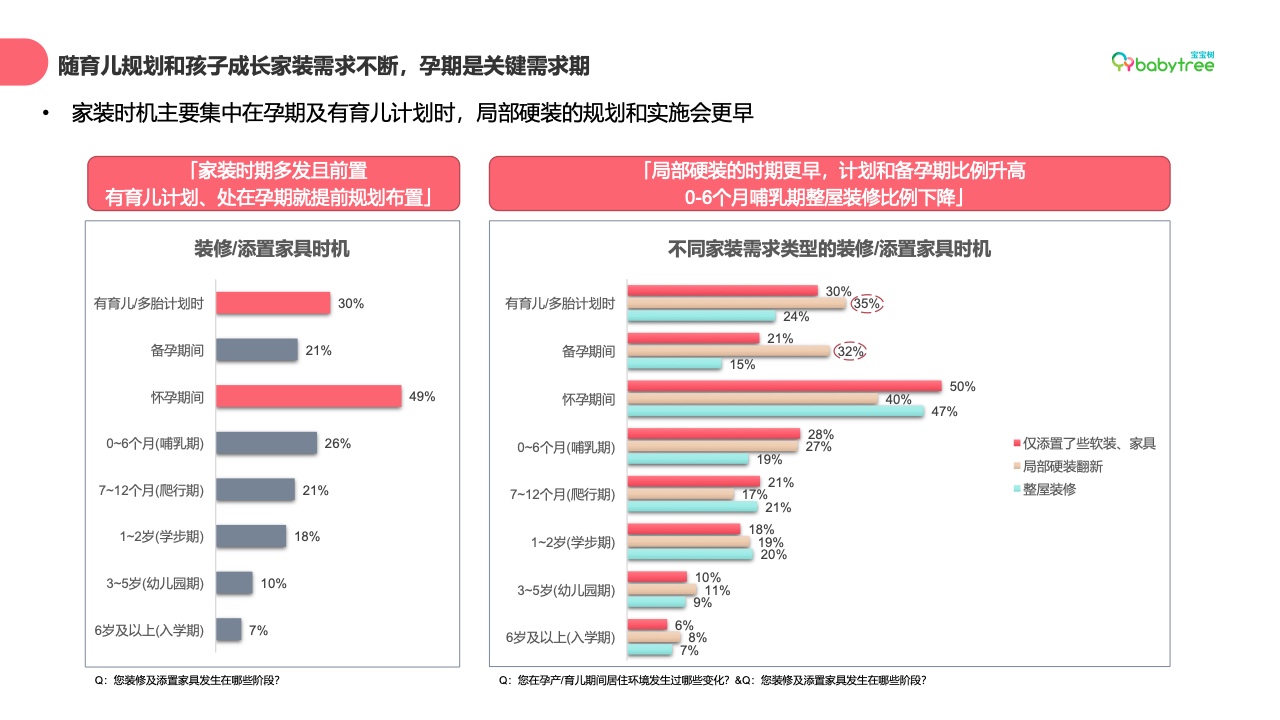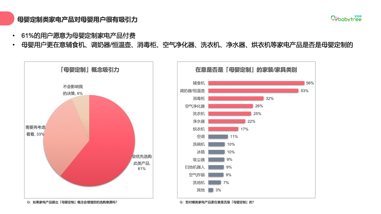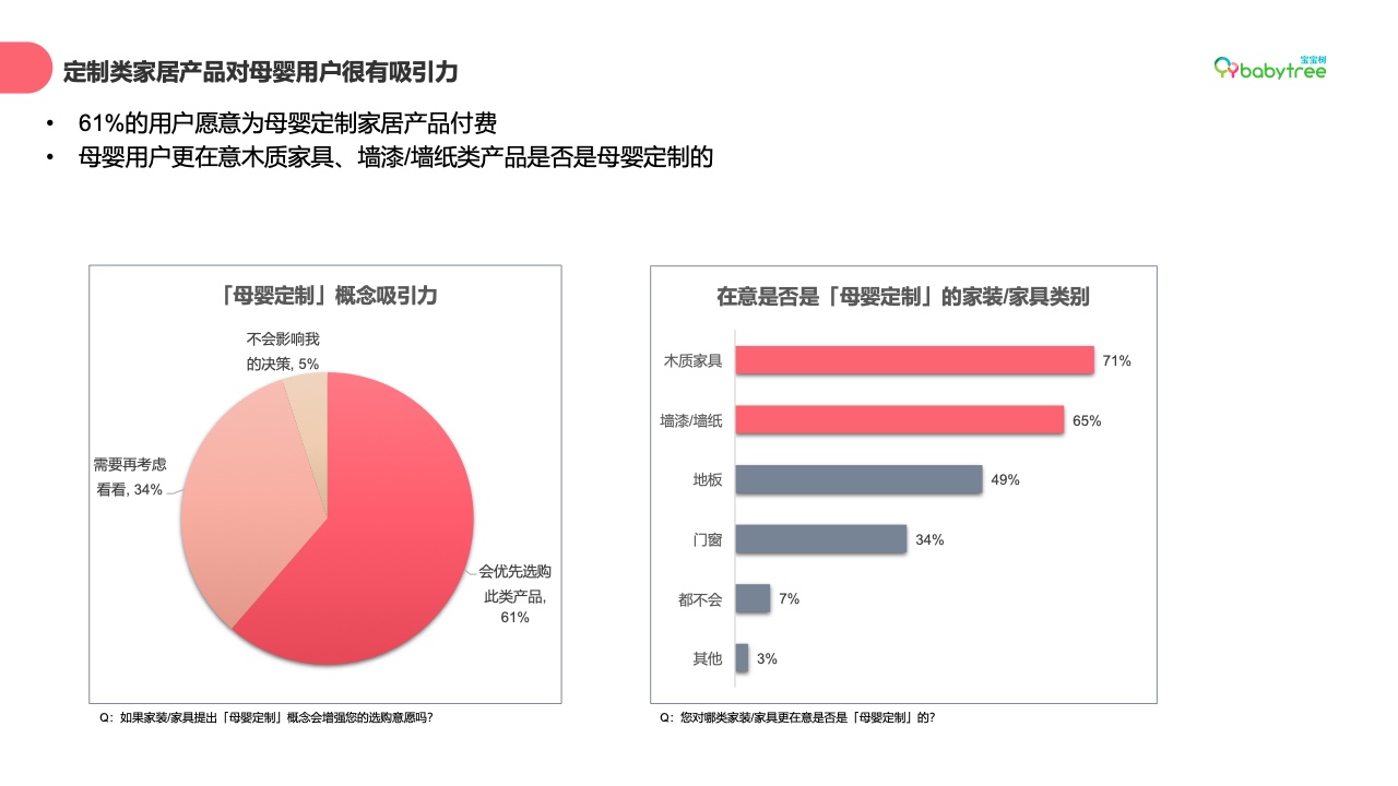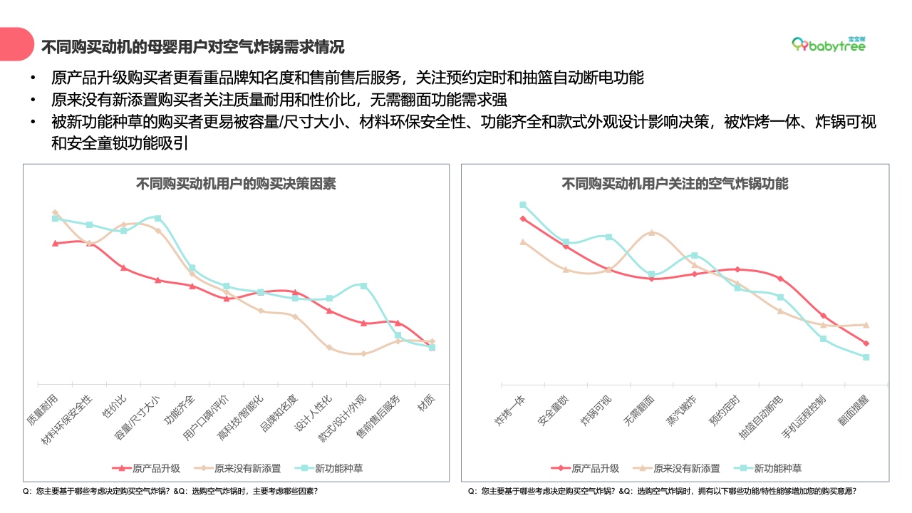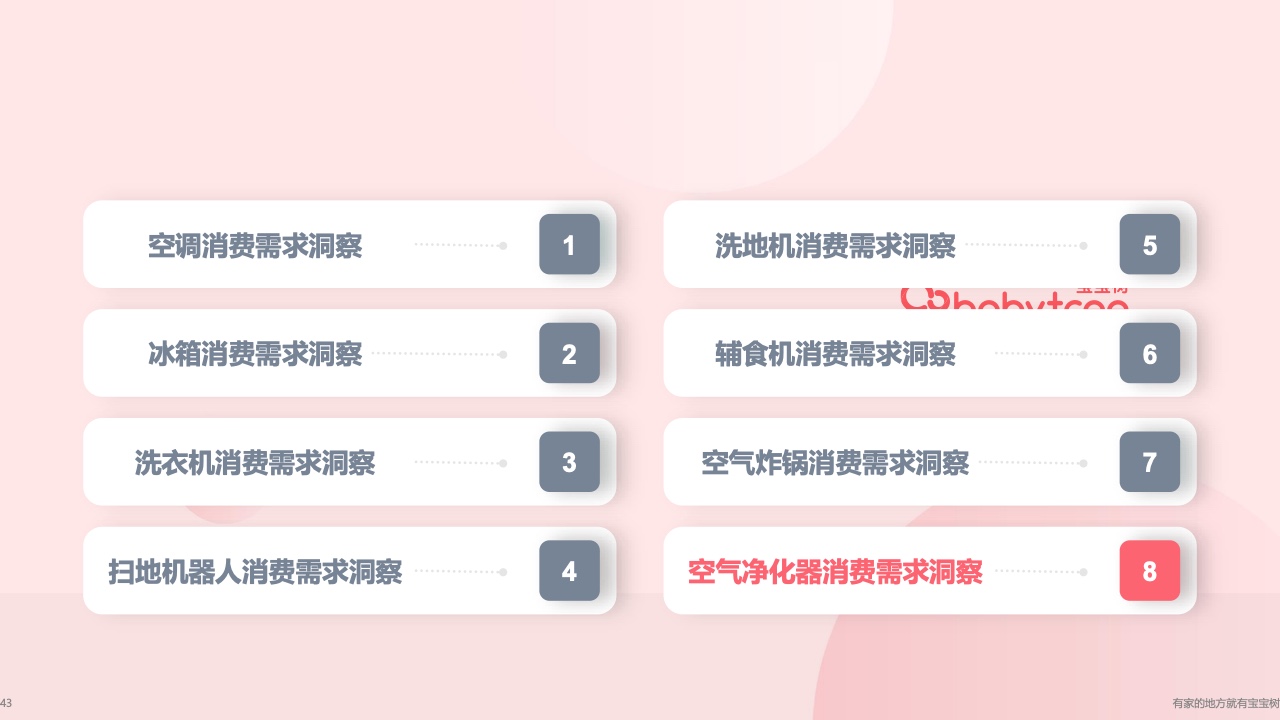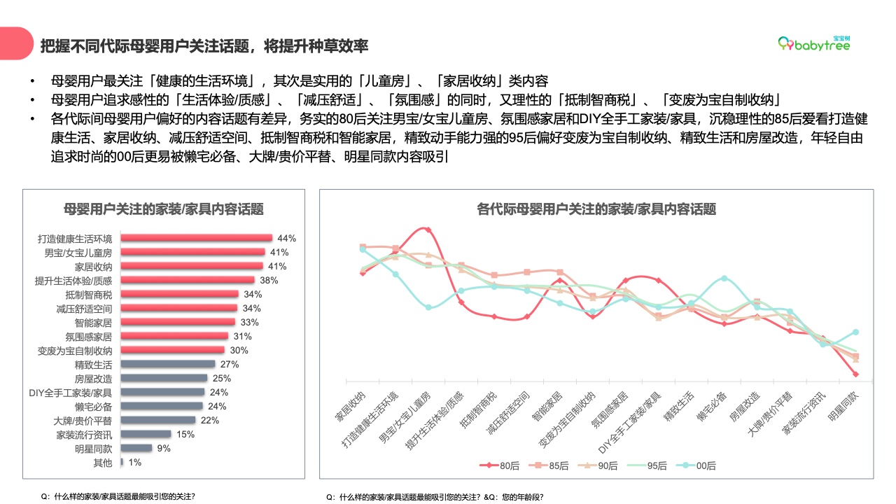 • 随着新生代用户消费水平的日益提升,其对于家庭生活品质的追求也越来越高,消费升级催生了 如绿色/环保、品质/健康、智能/便捷、功能/实用、个性/美观等多元需求。与此同时,随着孩子 的到来/即将到来、家庭生活方式的变迁,对于家庭的舒适度、安全性、功能性、便捷度等方面 有着更高的诉求。