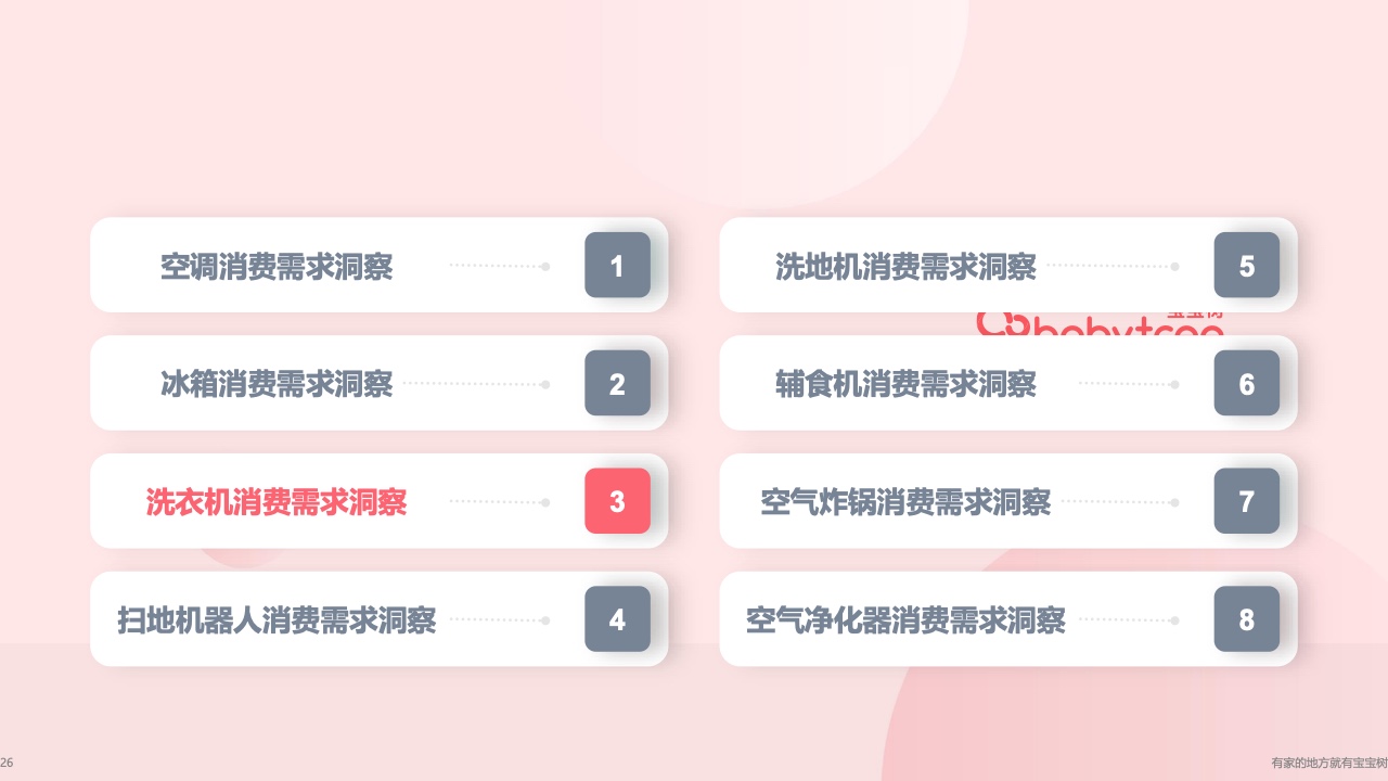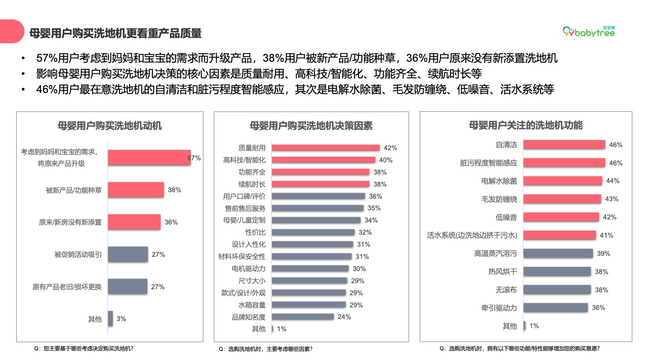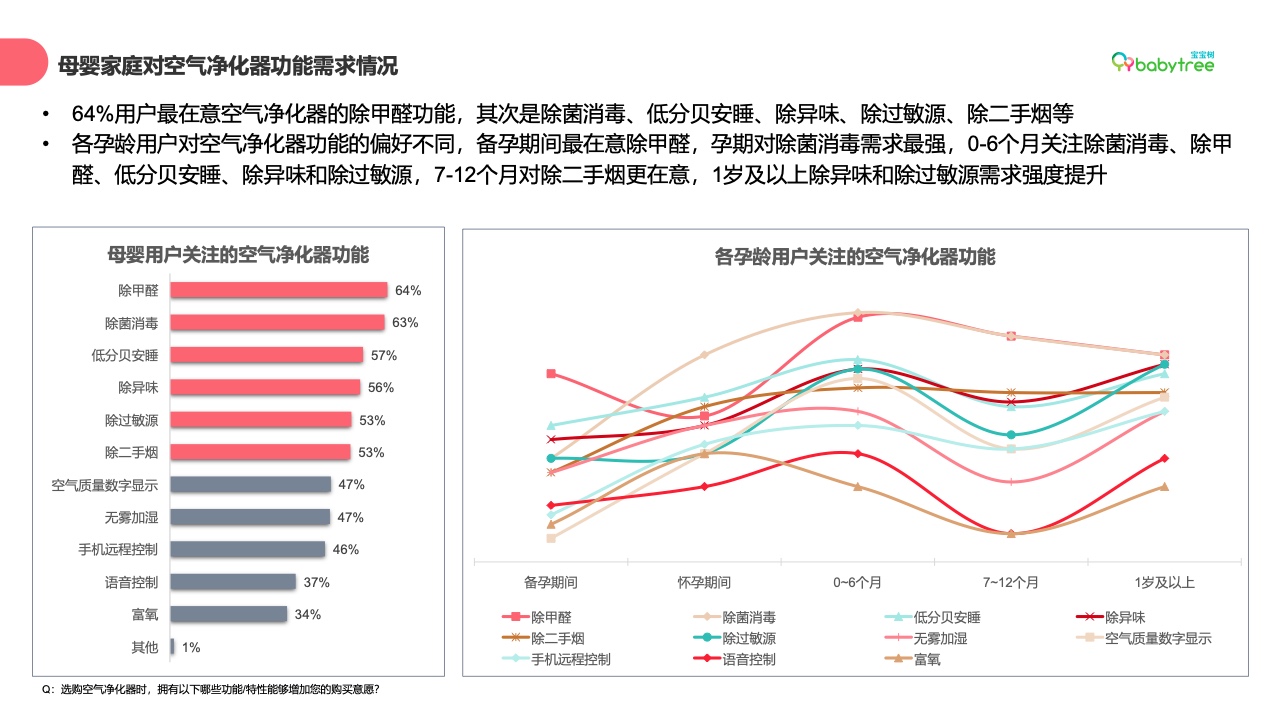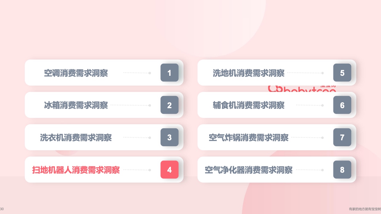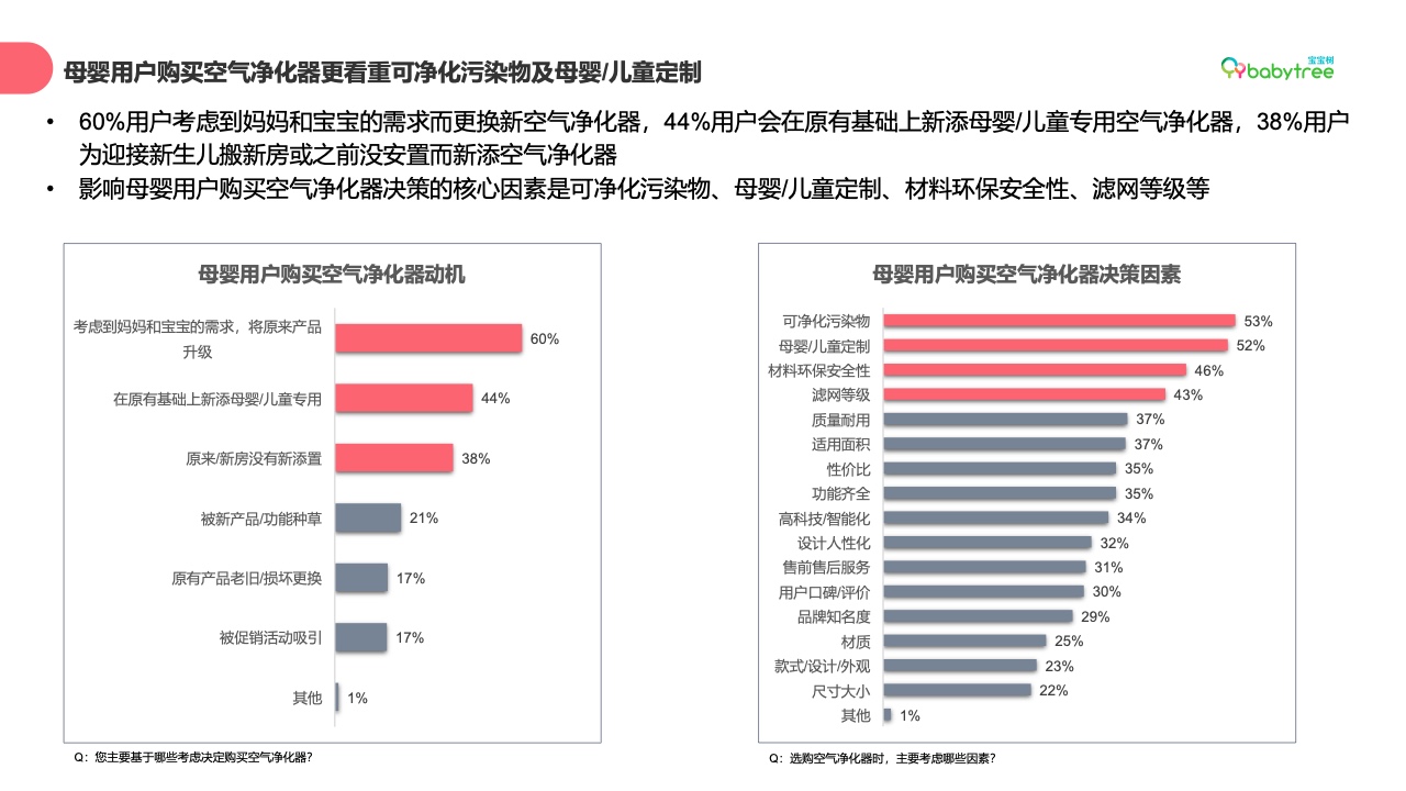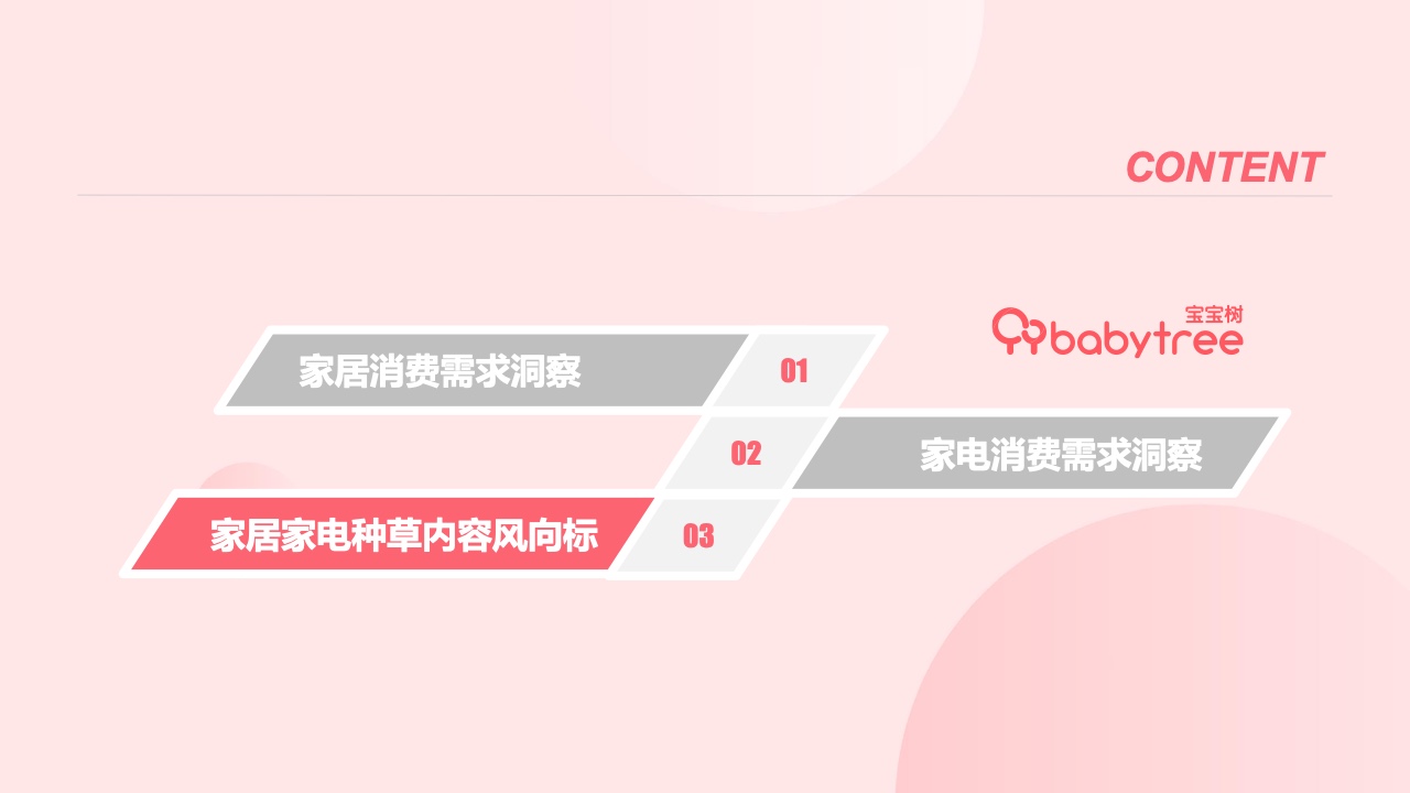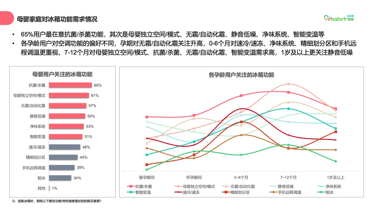 • 随着新生代用户消费水平的日益提升,其对于家庭生活品质的追求也越来越高,消费升级催生了 如绿色/环保、品质/健康、智能/便捷、功能/实用、个性/美观等多元需求。与此同时,随着孩子 的到来/即将到来、家庭生活方式的变迁,对于家庭的舒适度、安全性、功能性、便捷度等方面 有着更高的诉求。
