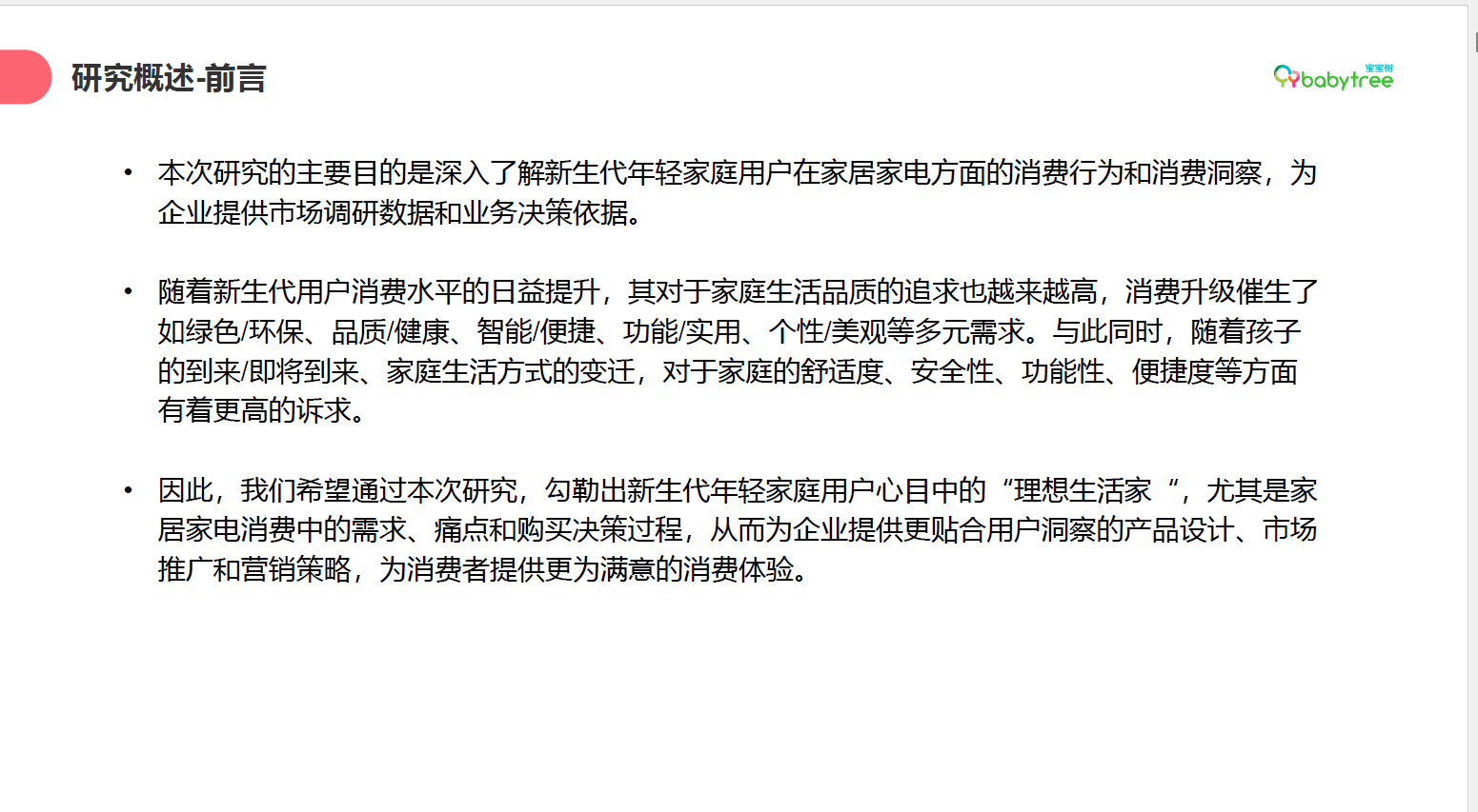 • 本次研究的主要目的是深入了解新生代年轻家庭用户在家居家电方面的消费行为和消费洞察,为企业提供市场调研数据和业务决策依据。