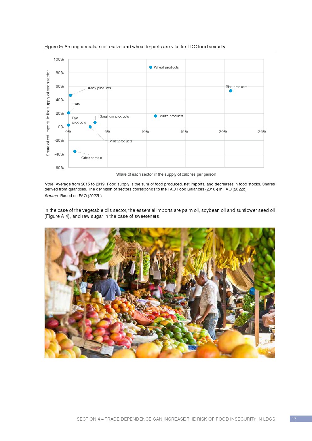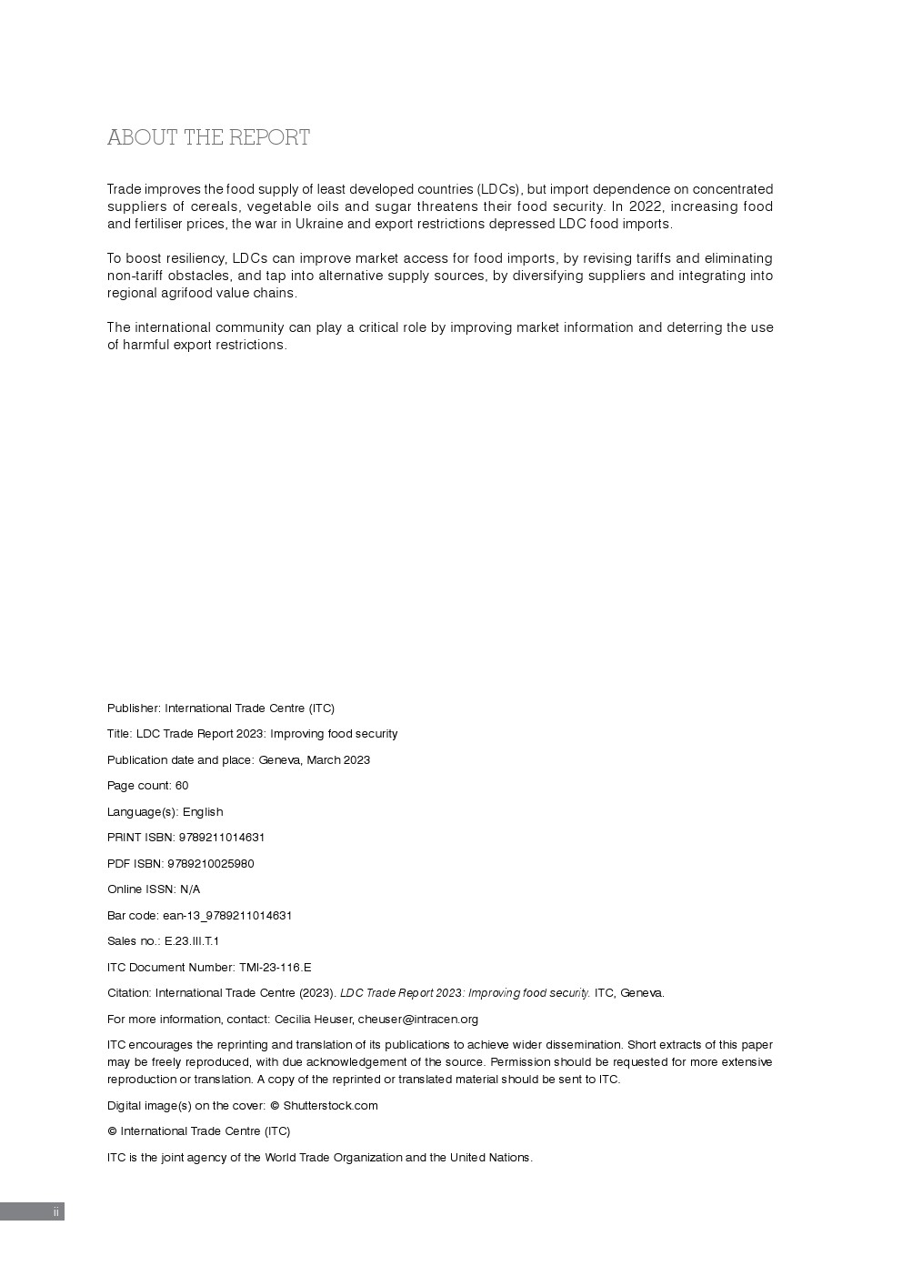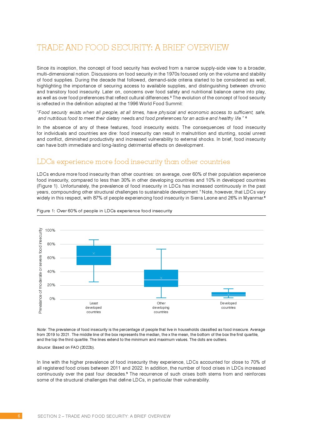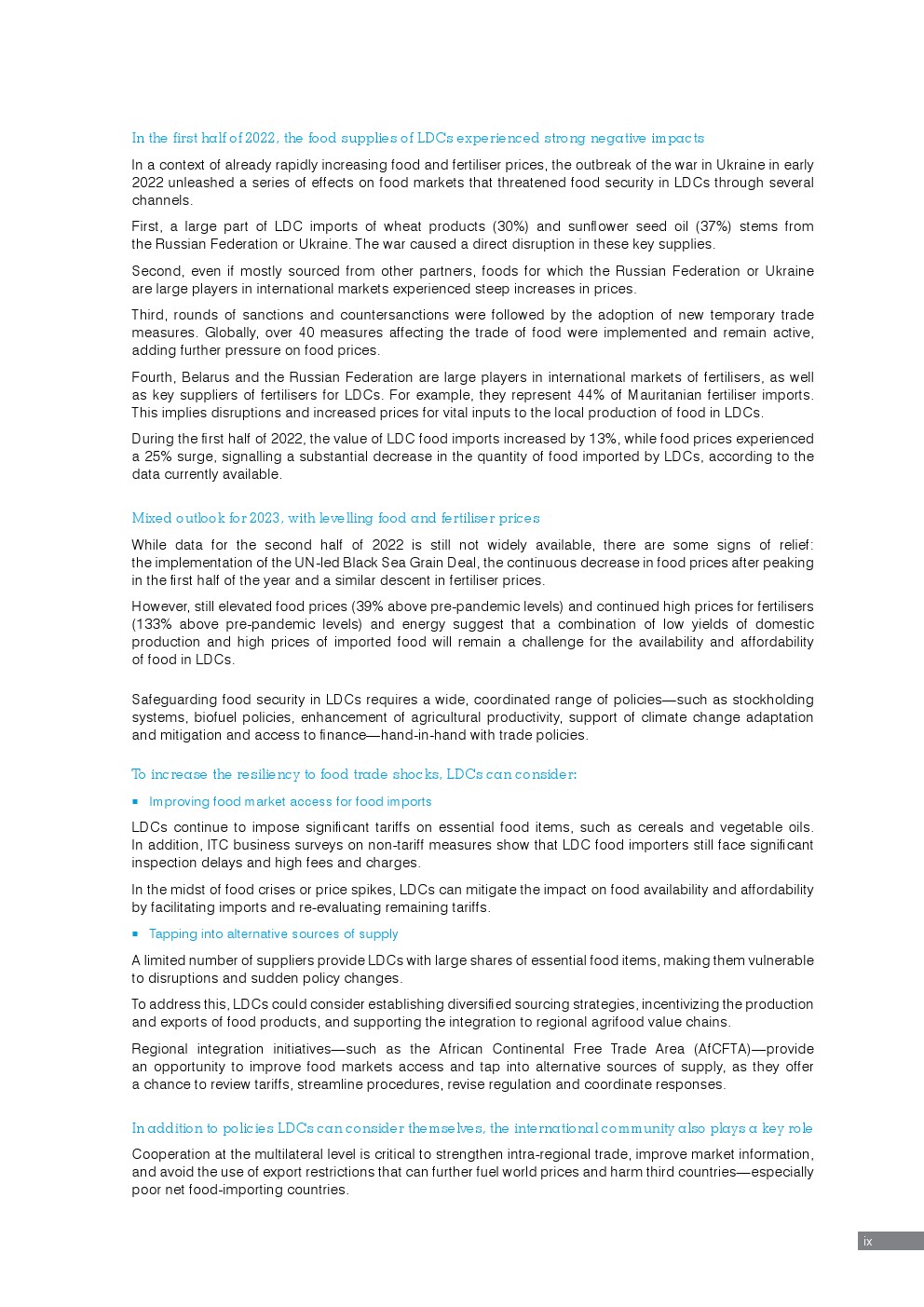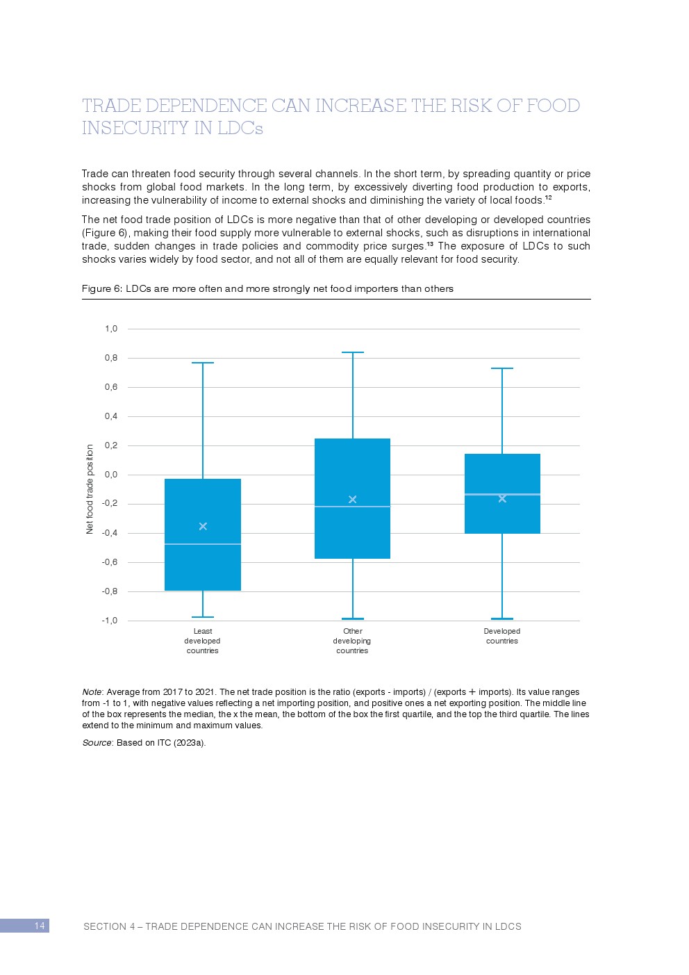 国际贸易中心发布了“2023年不发达国家贸易报告”。最不发达国家60%以上的人口面临粮食不安全问题,是其他发展中国家的两倍,是发达国家的六倍。贸易可以改善人们获得粮食的机会,但它也可以传播冲击的后果,如冲突、气候变化或国际价格或贸易政策的变化。在全球不确定的背景下,报告评估了贸易对最不发达国家粮食安全的作用,并概述了提高抵御力的政策选择。