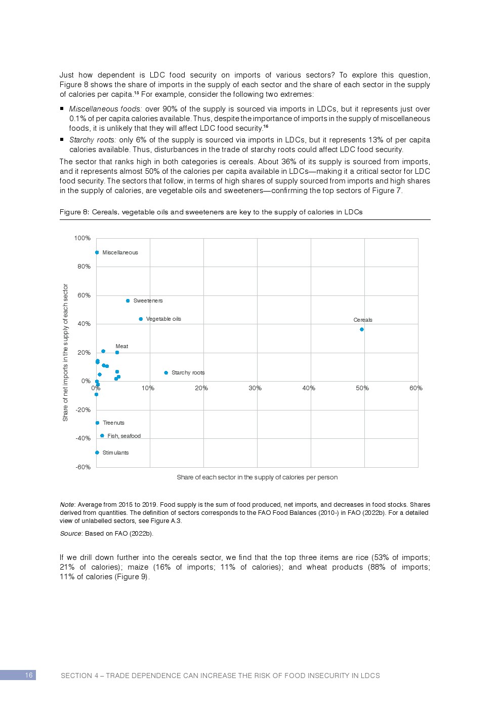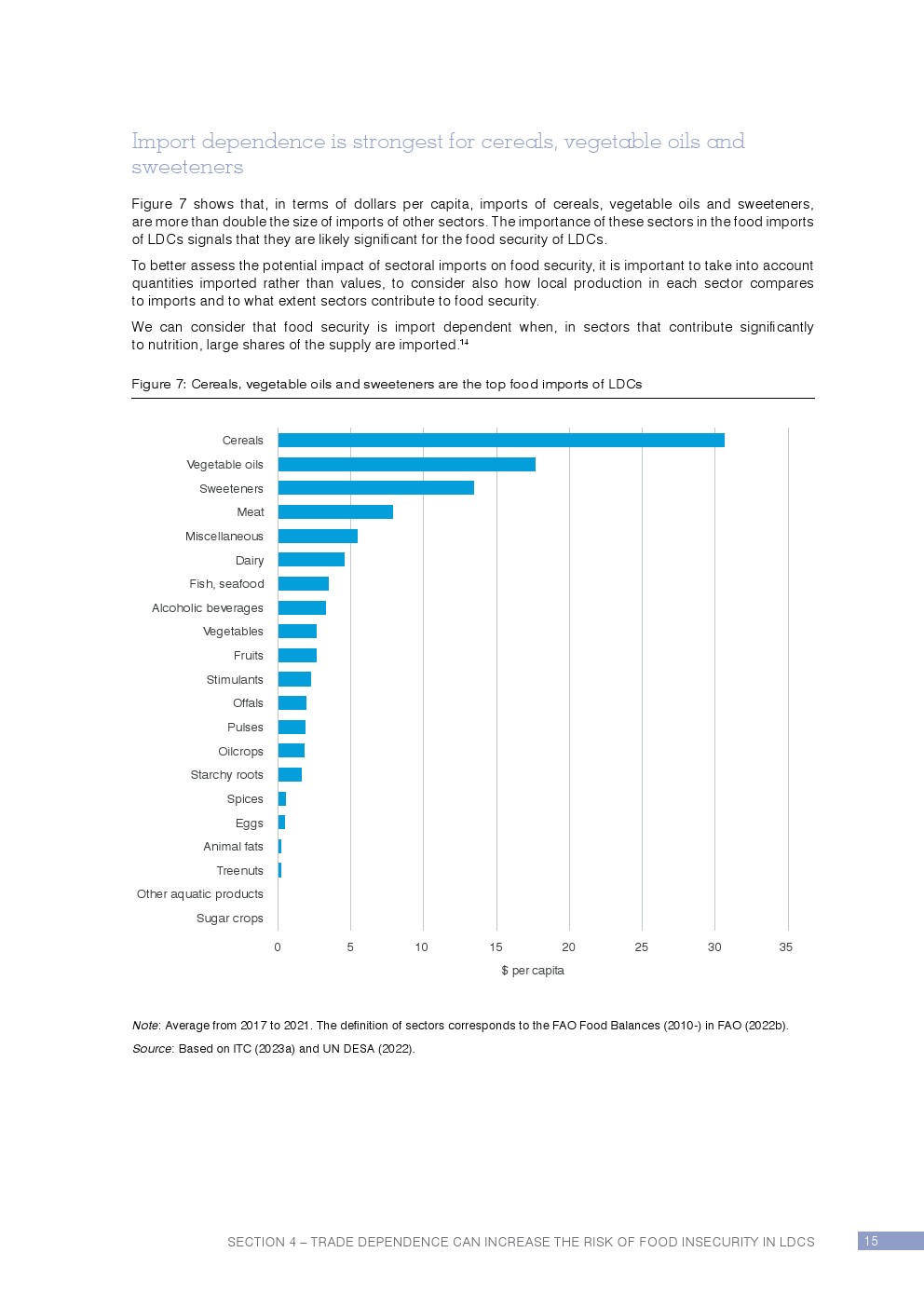 由于人均粮食产量低于其他国家,最不发达国家在很大程度上依赖进口粮食。总体而言,最不发达国家14%的粮食供应来自净进口,但却使它们更容易受到冲击。
