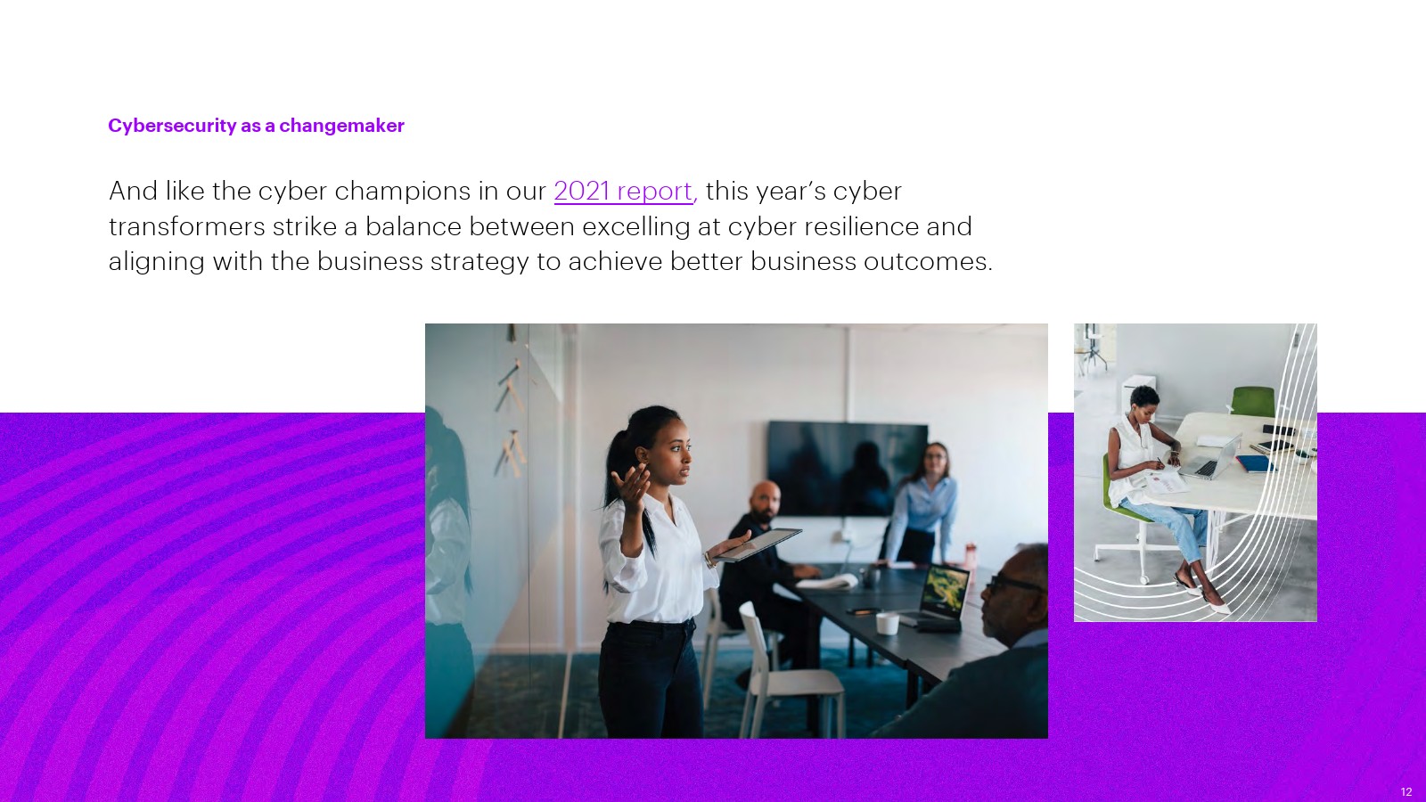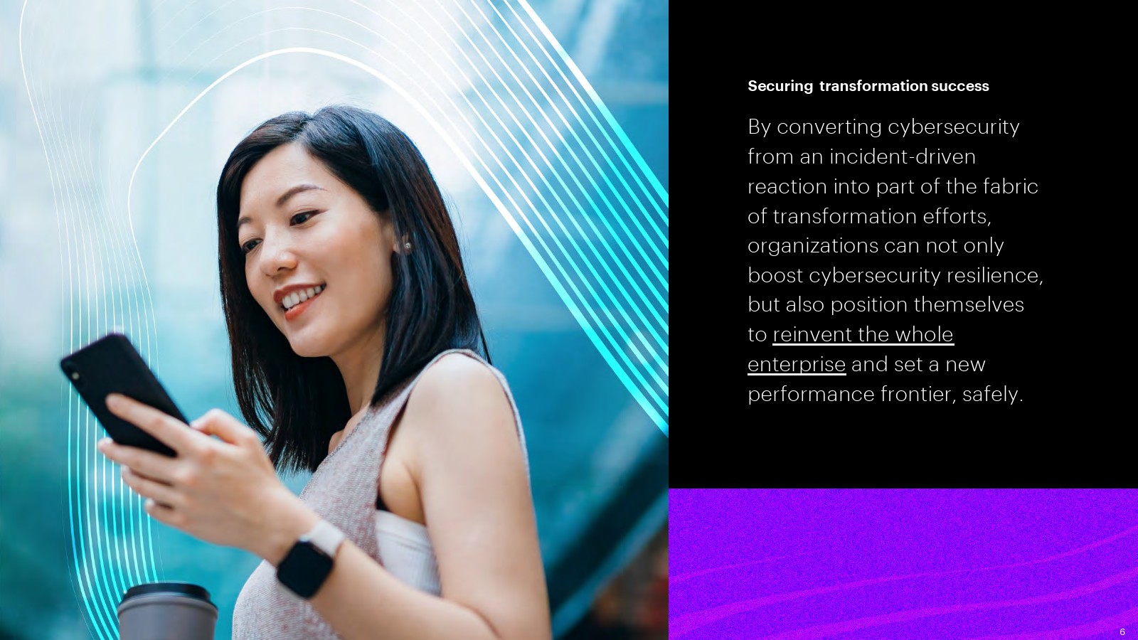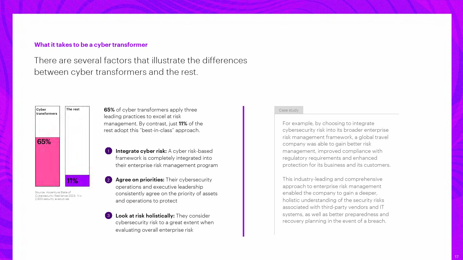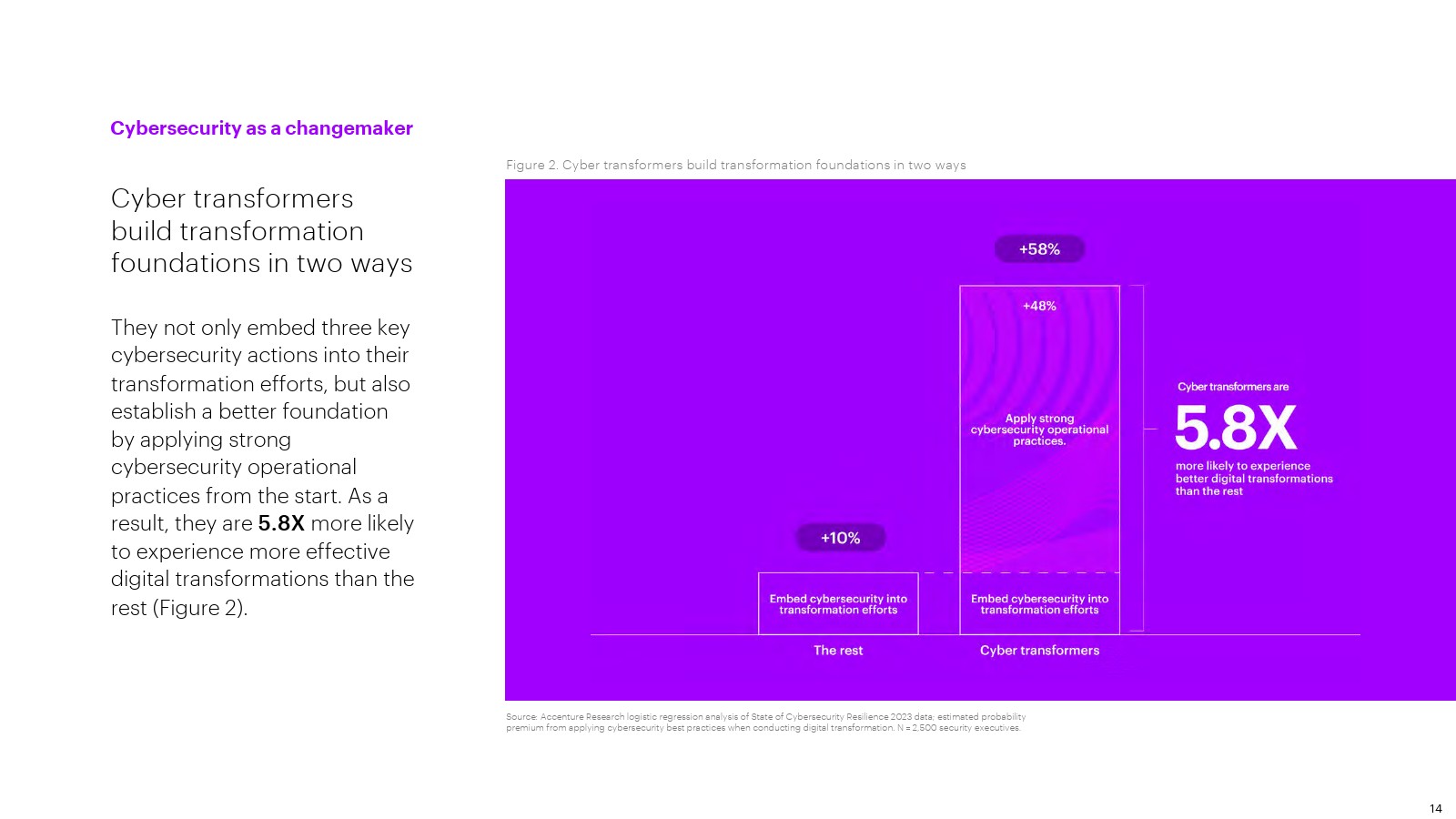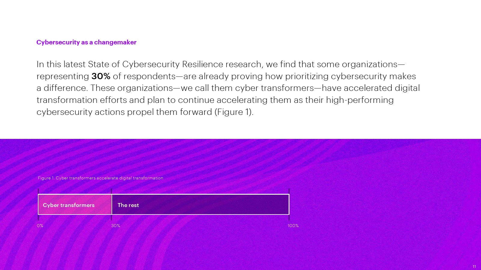 基于对欧洲、北美、南美和亚太地区大型组织的3000名安全和业务高管的调查,报告确定了一组在网络安全方面处于领先地位的公司。这些公司在网络弹性和配合业务战略以实现更好的业务成果之间取得了平衡,埃森哲称之为“网络变革者”,占受访者的30%。