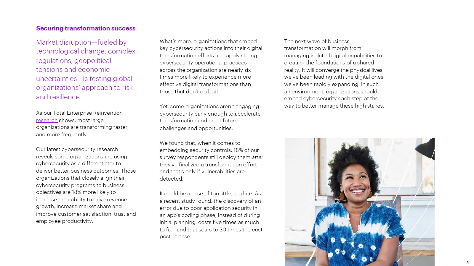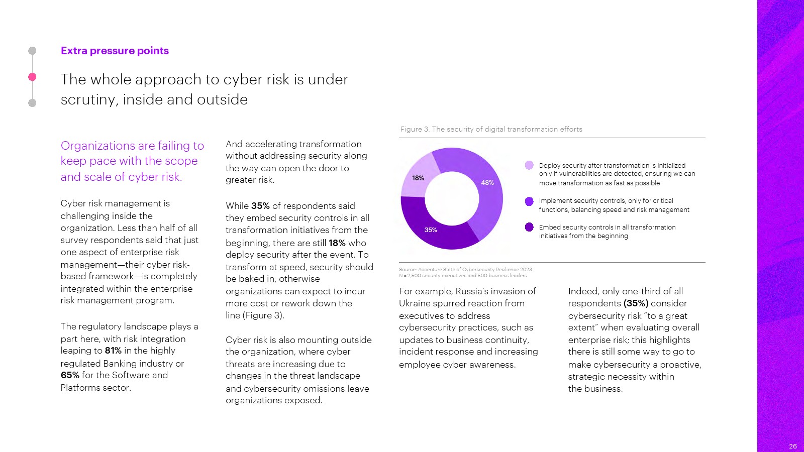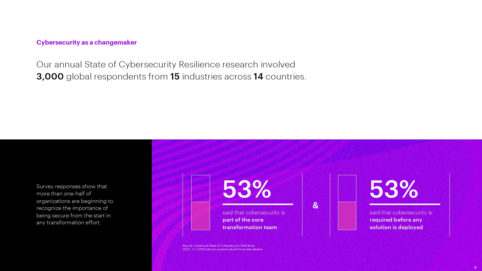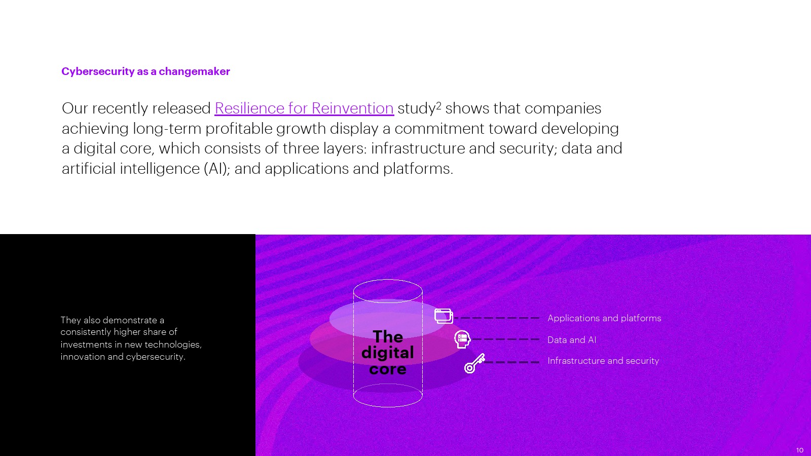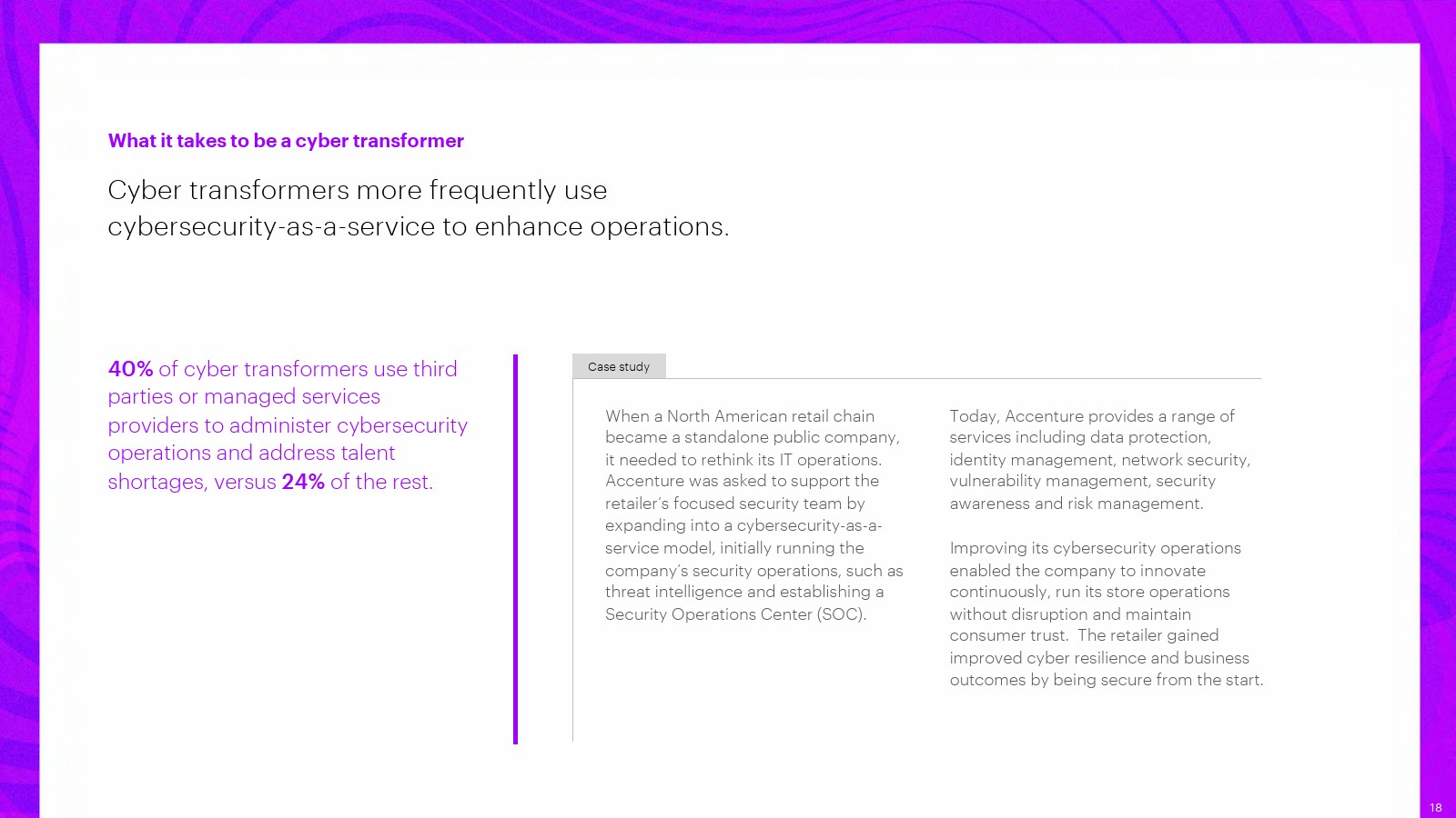 基于对欧洲、北美、南美和亚太地区大型组织的3000名安全和业务高管的调查,报告确定了一组在网络安全方面处于领先地位的公司。这些公司在网络弹性和配合业务战略以实现更好的业务成果之间取得了平衡,埃森哲称之为“网络变革者”,占受访者的30%。