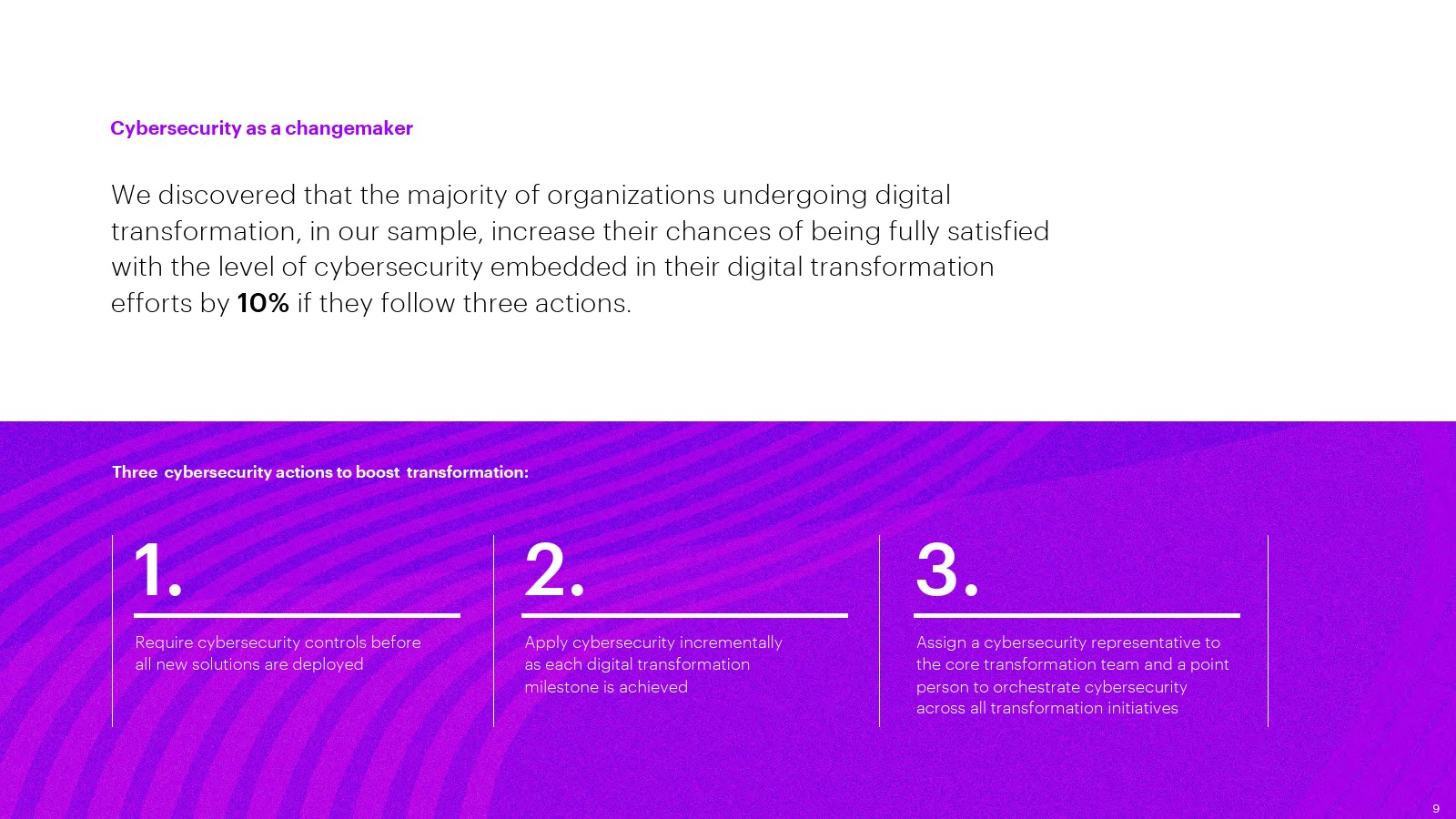 报告强调,在数字化转型工作中嵌入三个关键网络安全行动并在整个组织中应用强大的网络安全实践的组织更有可能实现更有效的数字化转型。为提高其数字化转型的成功和满意度,组织可以采取的网络安全行动: