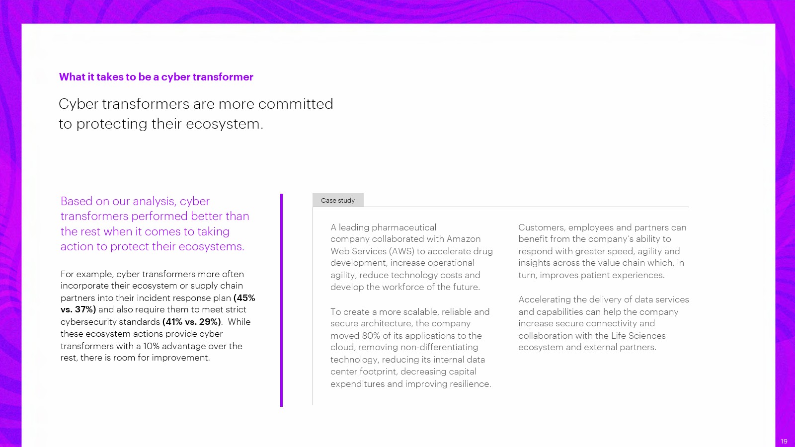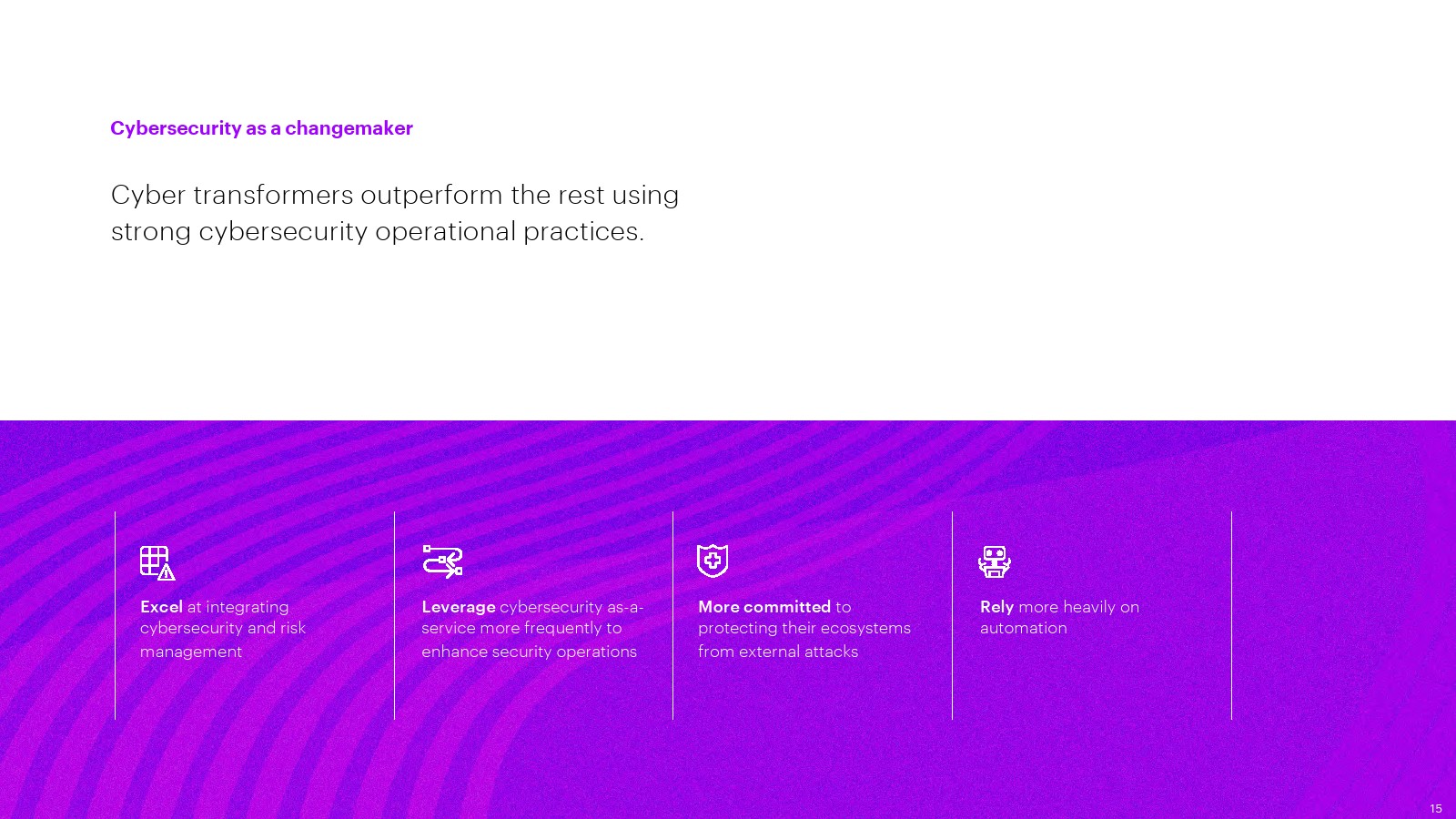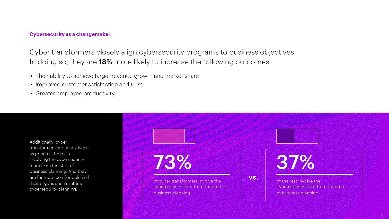 - 更致力于保护生态系统。网络变革者比其他人更有可能采取行动,将其生态系统或供应链合作伙伴纳入其事件响应计划(45%对37%),并要求他们满足严格的网络安全标准(41%对29%)。