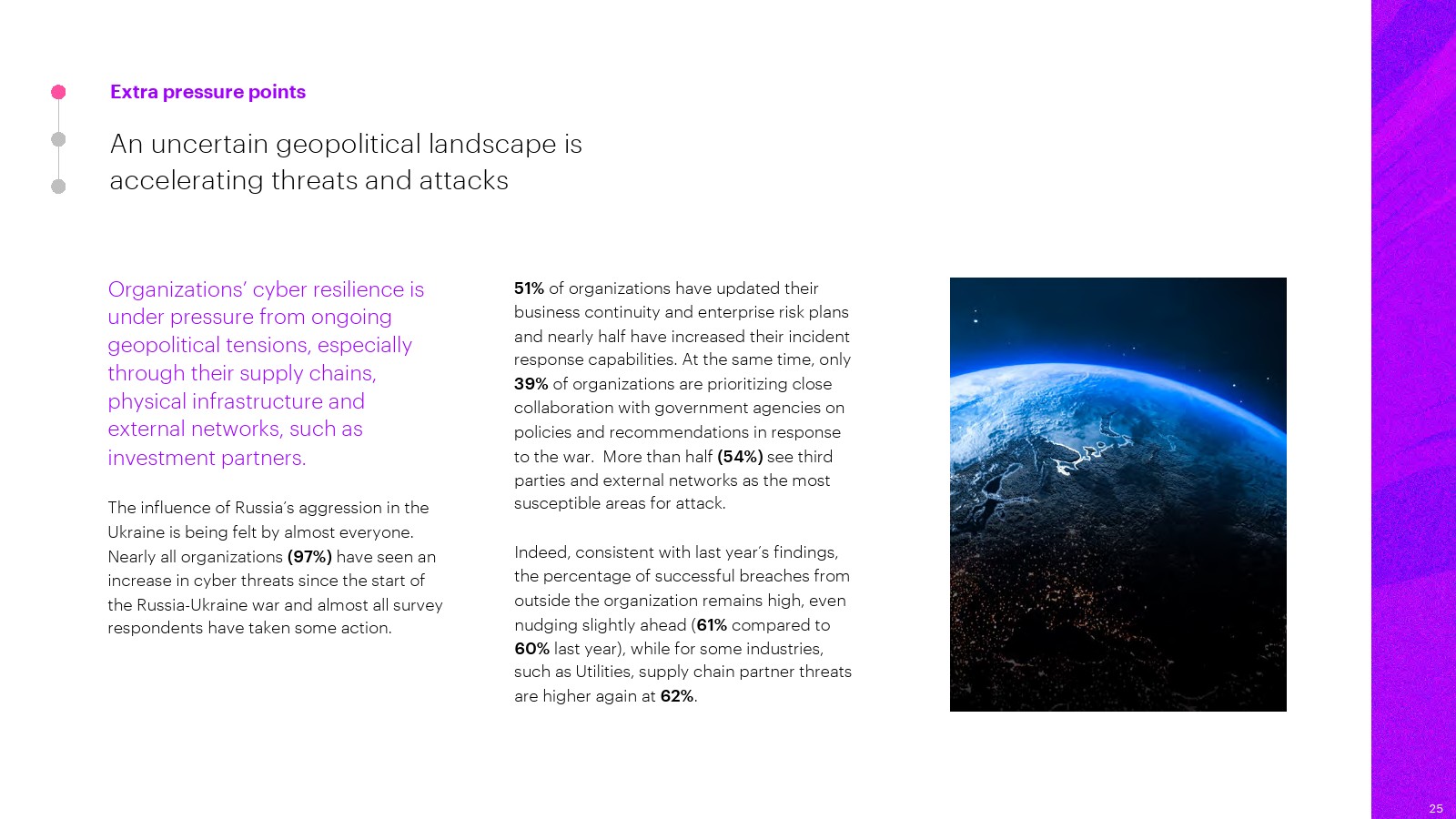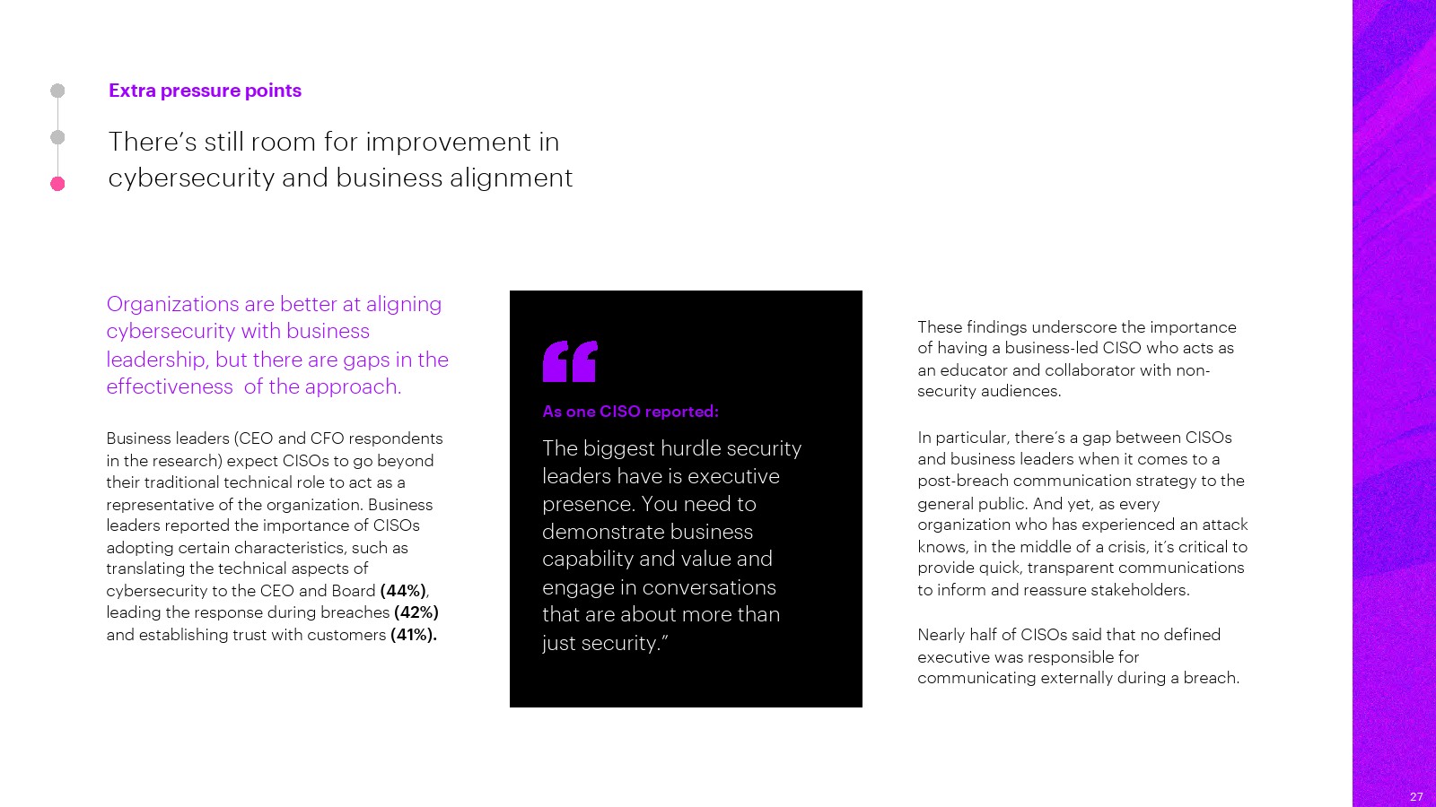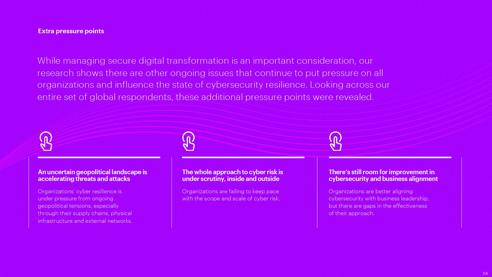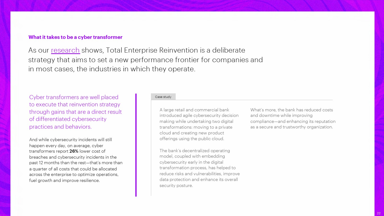 - 更致力于保护生态系统。网络变革者比其他人更有可能采取行动,将其生态系统或供应链合作伙伴纳入其事件响应计划(45%对37%),并要求他们满足严格的网络安全标准(41%对29%)。