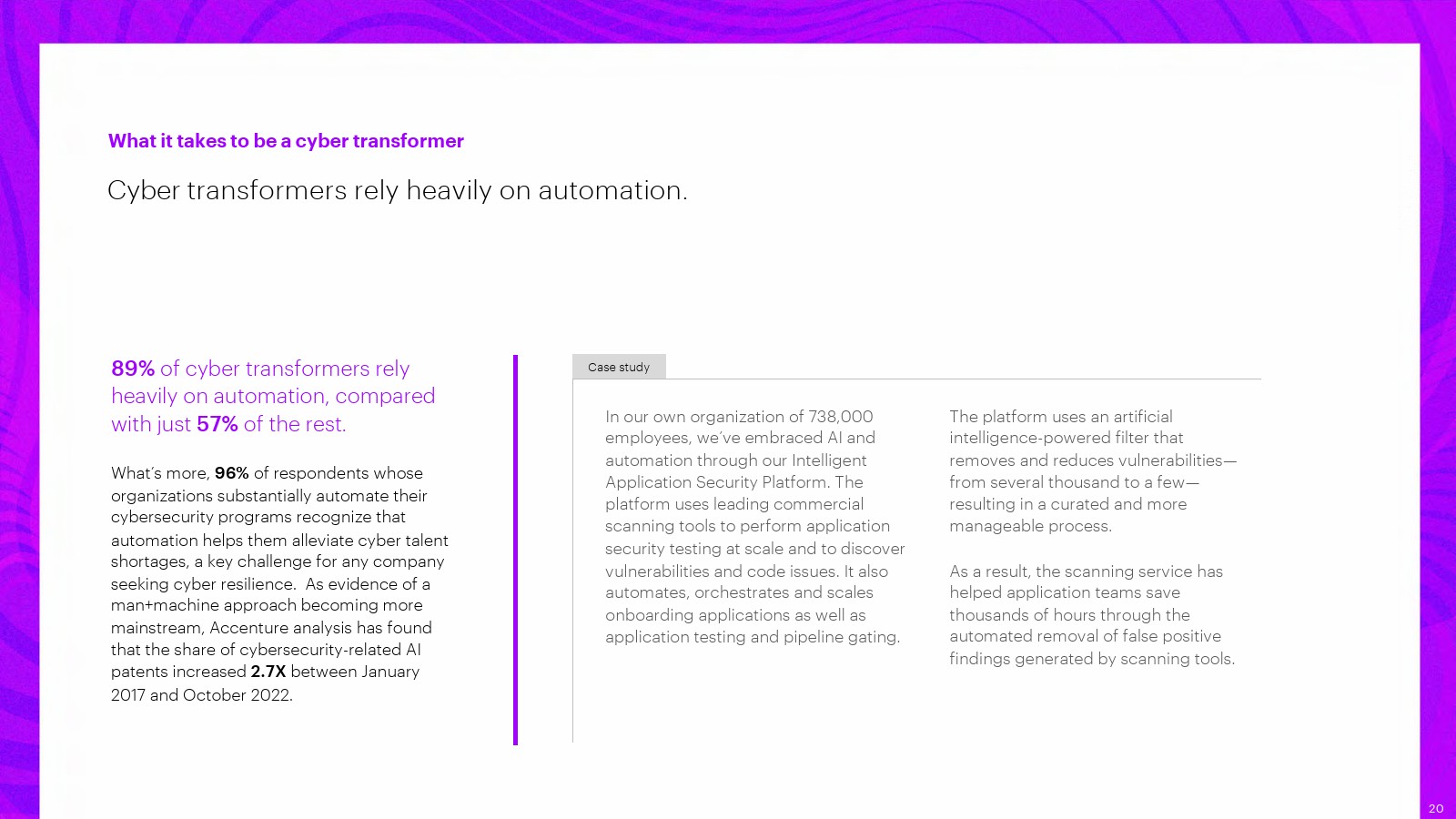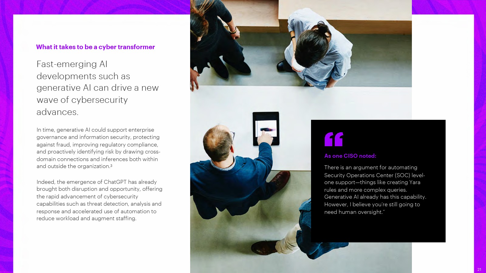 - 严重依赖自动化。网络变革者比其他人更有可能在网络安全计划中严重依赖自动化(89%对57%)。此外,96%的受访者表示,自动化帮助他们缓解了网络人才短缺的问题,这对任何寻求网络弹性的公司来说都是一个关键挑战。