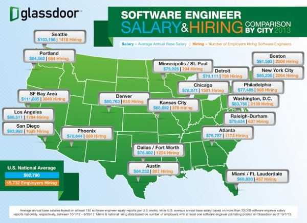 另外,Glassdoor还对美国几个主要科技城的软件工程师年薪也进行了比对。不出所料,旧金山地区的薪资为业界最高,而像西雅图圣地亚哥等地的年薪也都要高于平均水平。
