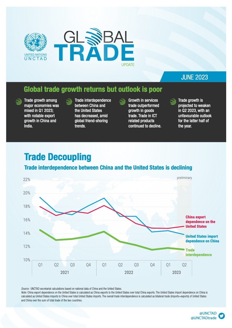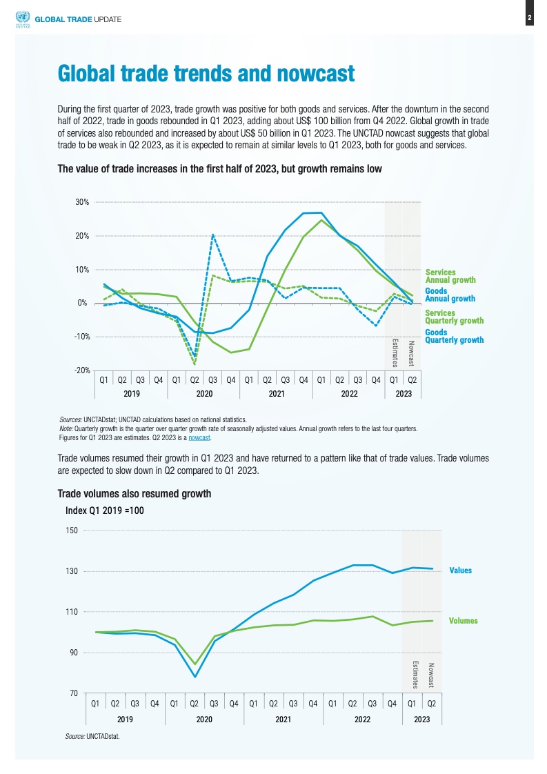 根据联合国贸易和发展会议近日发布的《全球贸易最新动态》,在经历了2022年下半年的低迷之后,今年第一季度,全球货物和服务贸易出现反弹,但今年余下的时间全球贸易的前景黯淡。