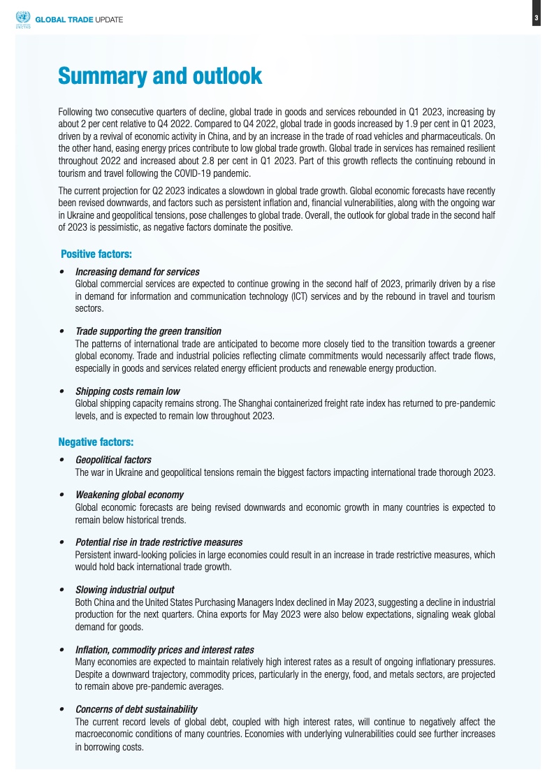 报告称:“总体而言,2023年下半年全球贸易前景悲观,负面因素占据主导地位。”